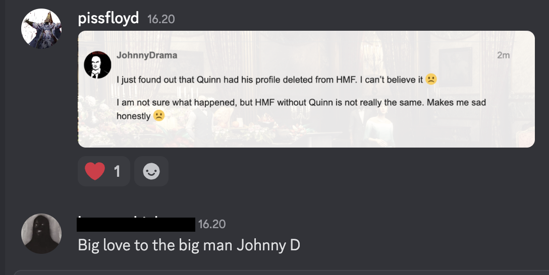 I just found out that Quinn had his profile deleted from HMF. I can’t believe it ![]()