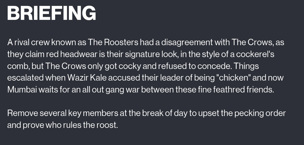 Rooster / centred around the crows in Mumbai with only 1 specific kill condition, a beak staff kill (which is readily available from a couple of spots nearby), as it fit with the bird-fight theme of the contract. -