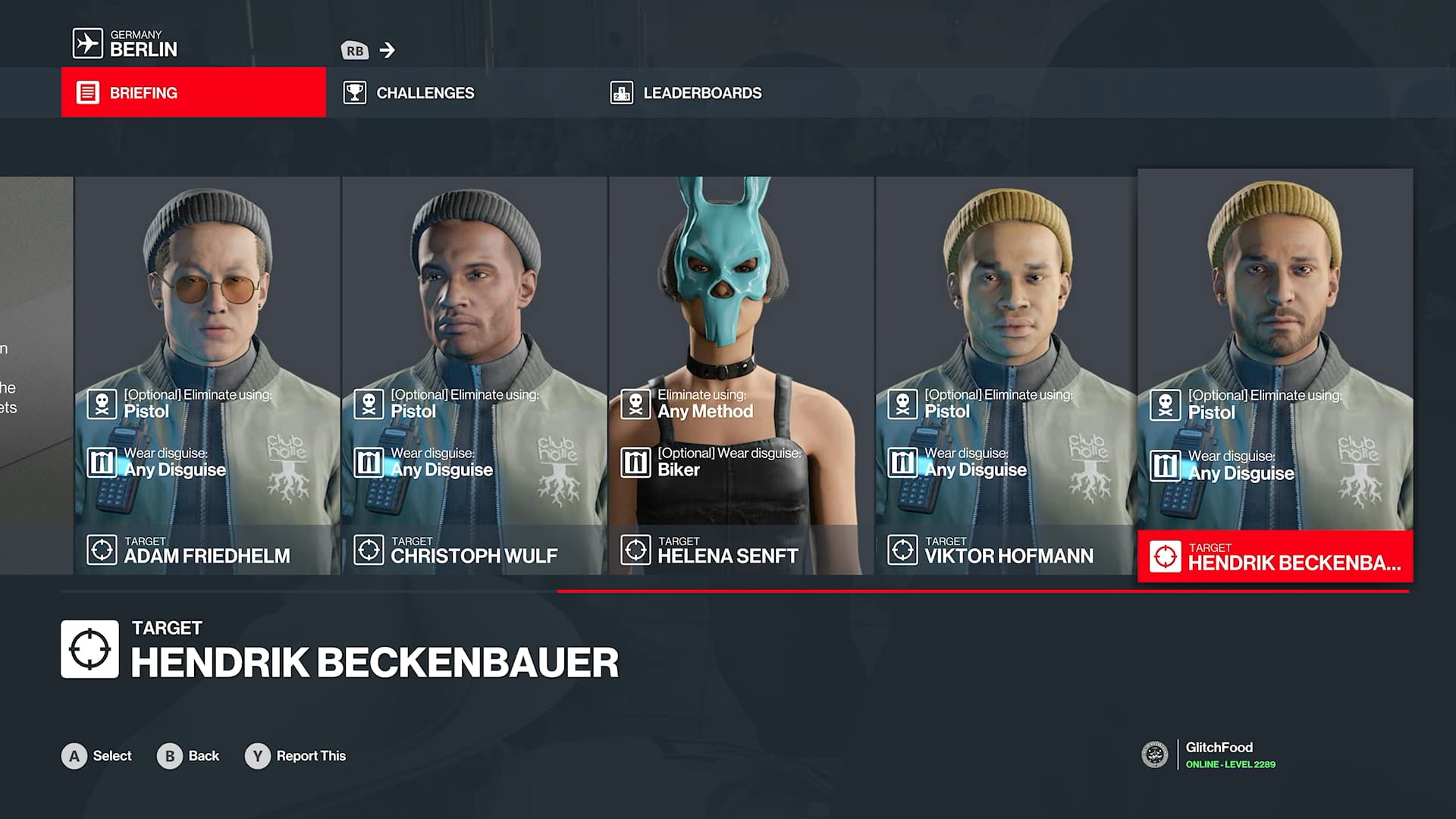 (Guard targets are pistol kills; any disguise. Helena is any method; Biker disguise).