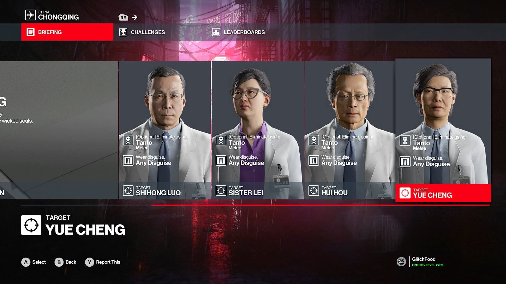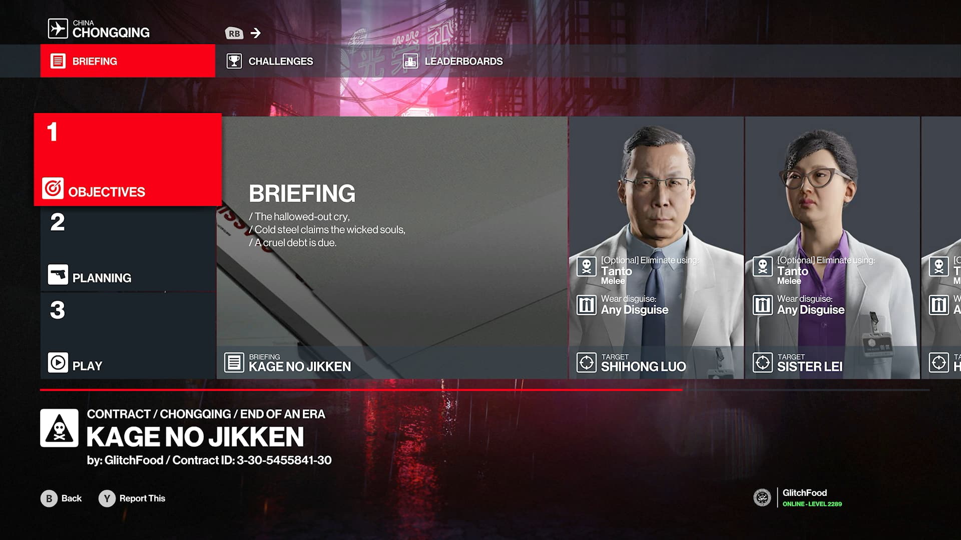 • All targets are researchers in Hush’s The Block building. All are tanto (on map, located in Hush’s Therapy room) melee. Any disguise; No complications