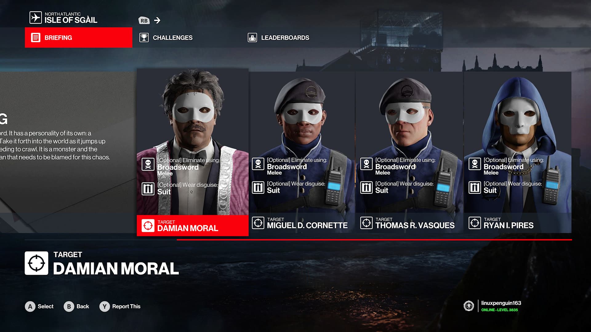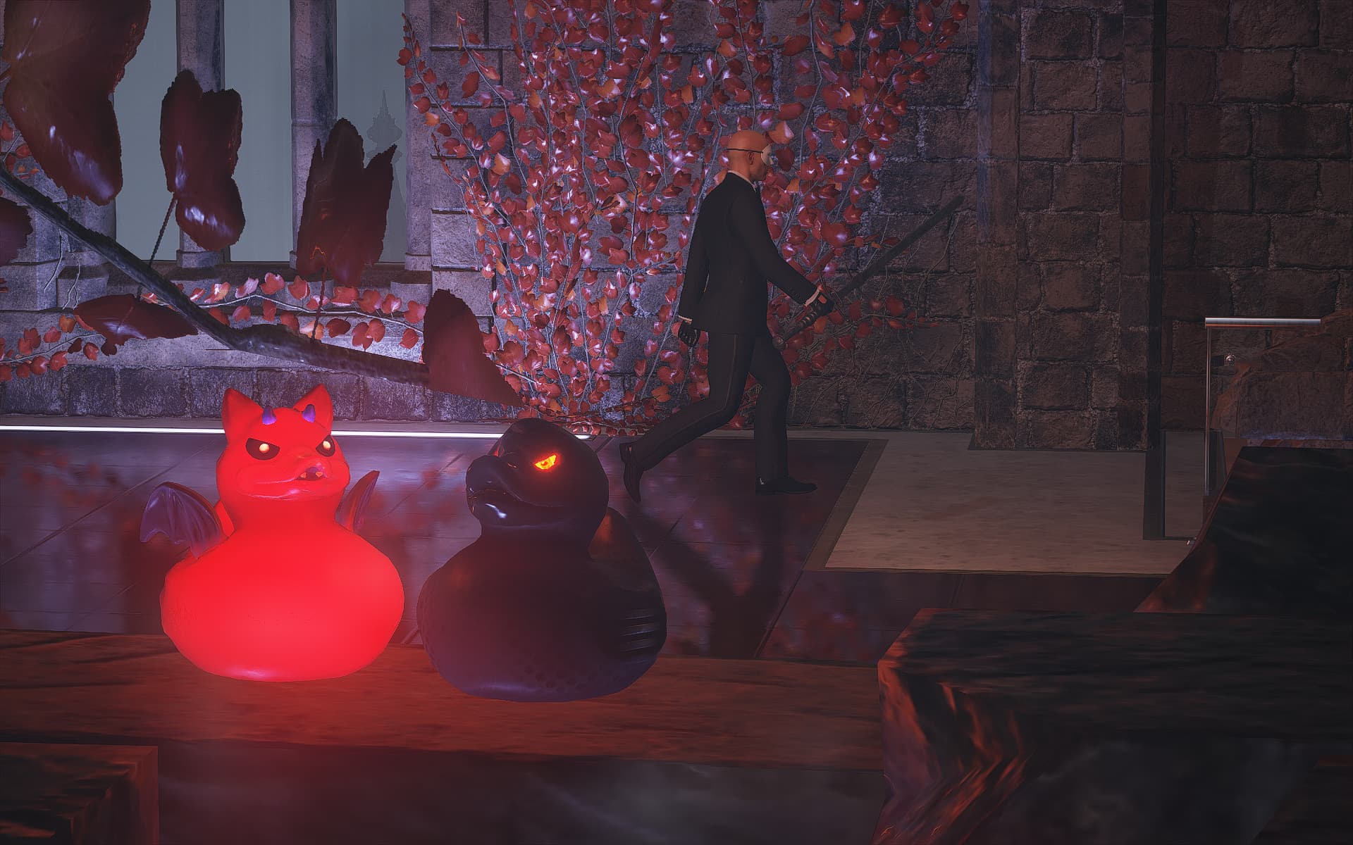 A short description of the contract (optional): There weren’t many samurais in Scotland, so the tsukumogami has to be a broadsword instead. The targets each have smuggle points or starting locations nearby that allow 47 to have the sword by the time they reach their first target, or alternatively it can be fetched from the top of the map to be chucked down towards Pires, the target near the Keep start, if the broadsword is not in the inventory. The verticality also means the sword itself may need some throwing to get to the right destination, as it can’t be held during agility.