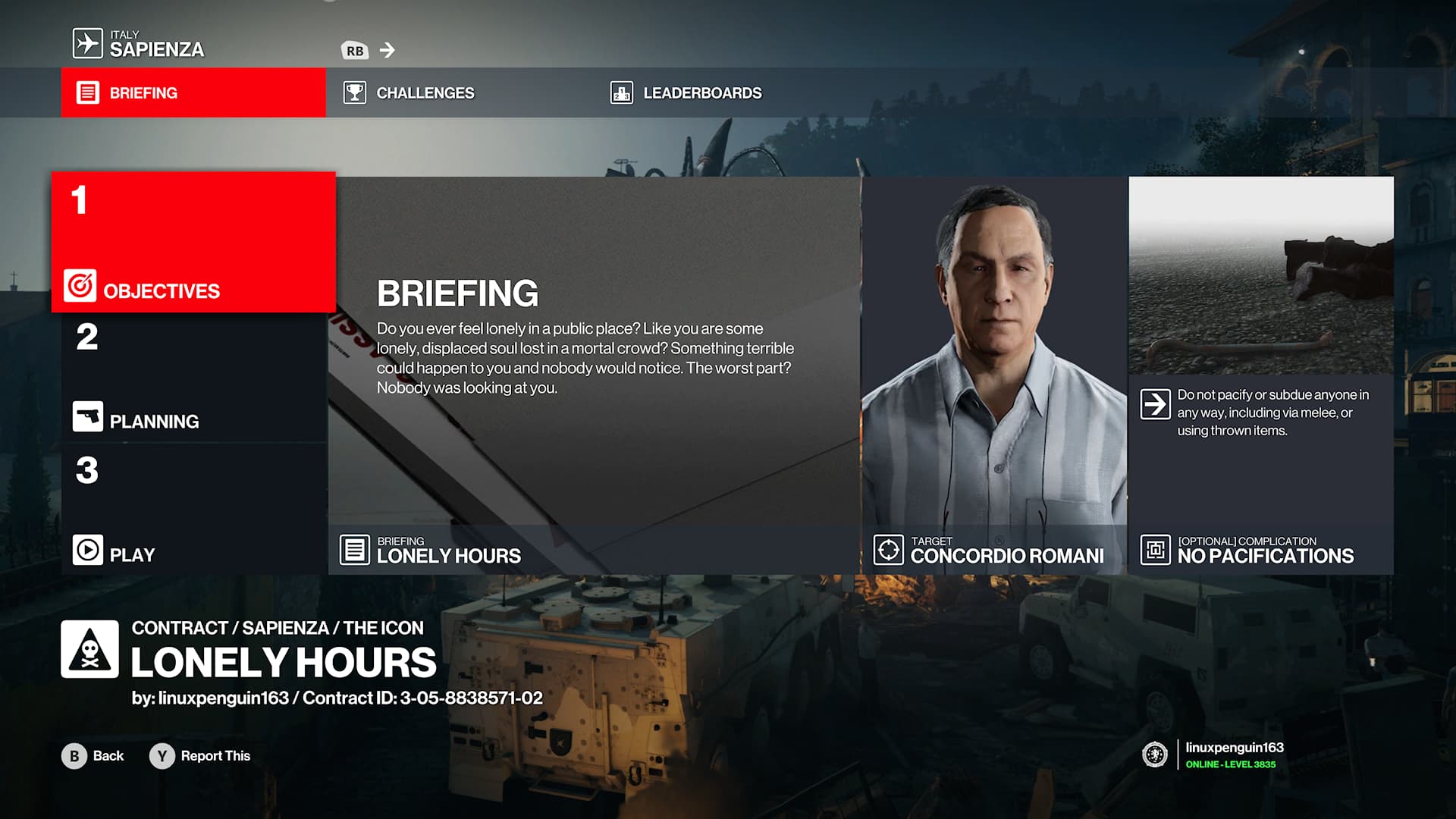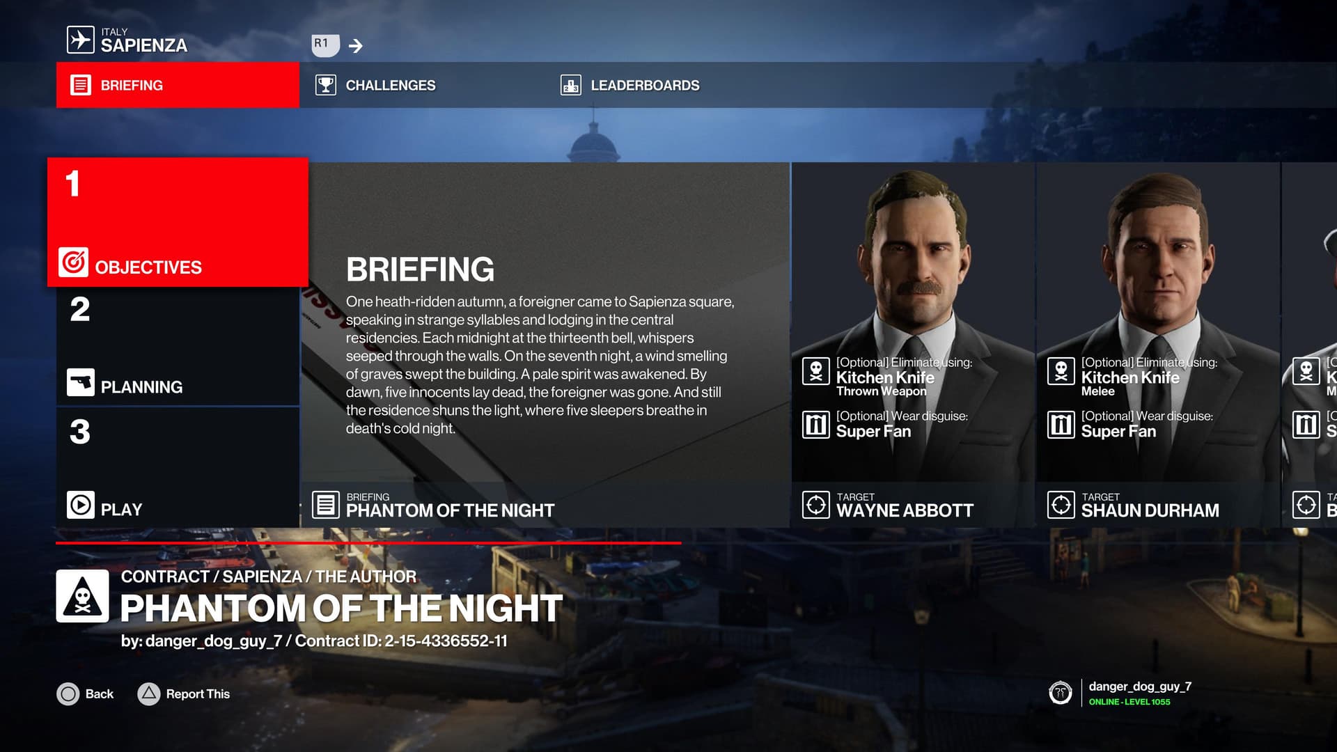 Contract Details (targets/kill conditions/complications): kill everyone dressed as the ghostly fan with a kitchen knife, without being spotted.