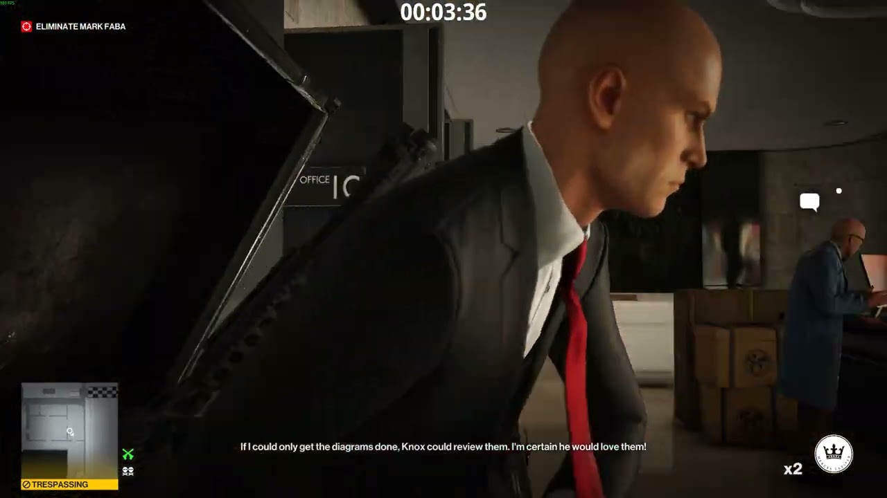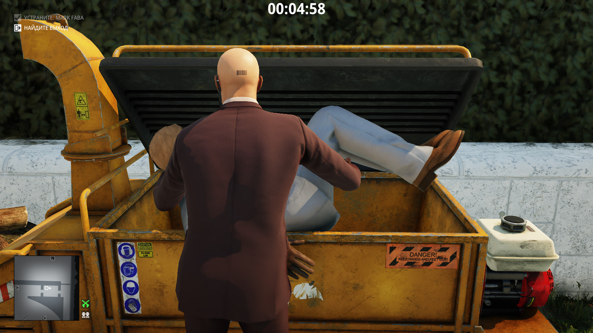 The kill itself went smoothly, but the question was, what Timothy Yu’s gonna do once he comes to meet Faba and he isn’t there? Really couldn’t be bothered replaying the entire ETA to find out, so in my mockup I “simulated” it by jabbing Faba with emetic. In that case he went back to his route, but on the real deal, when Faba was strangled and hidden in the chest, Yu just stood there and waited. This is actually easier, but I’m not expecting that, so I’m sitting in the chest behind him, thinking “will he turn around the moment I leave the chest or not?” Then I remember the bodyguards who must be on their way back after stashing guns, panic, and running straight into a researcher for no reason.