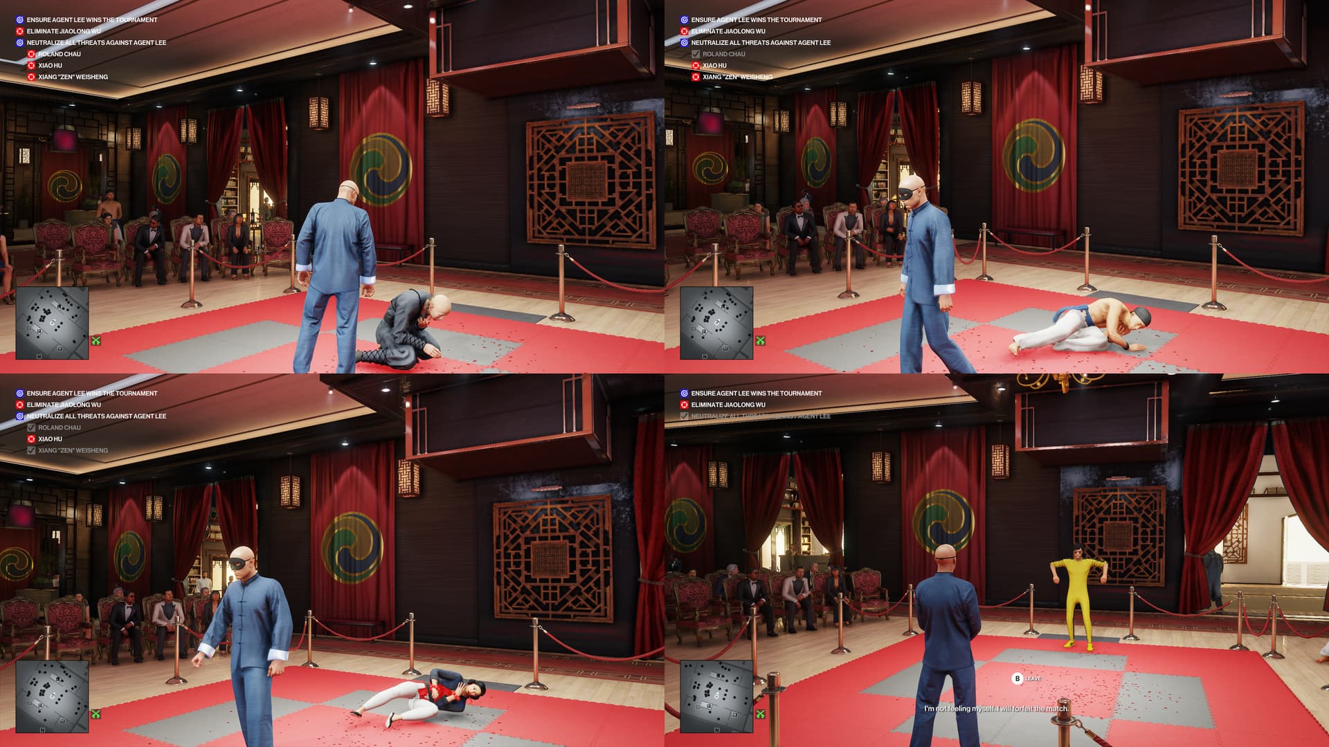 Basically, you can’t kill the targets and they have to participate in the competition and lose (47 can’t be the one to defeat them), while the main target dies in a fight to the death after Lee wins the competition.