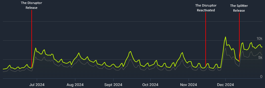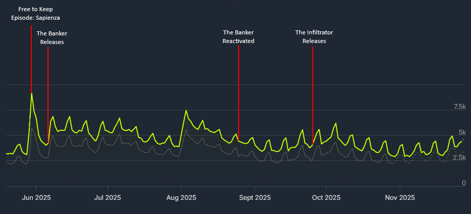 So far, neither of the CelebrETs this year have caused a massive spike in the player numbers on Steam like The Disruptor and The Splitter did last year. On Steam, the number of players on The Banker release weekend were lower than the weekend before, same thing happened when they re-released The Banker in August (likely due to the initial release flopping). It also repeated when The Infiltrator released.