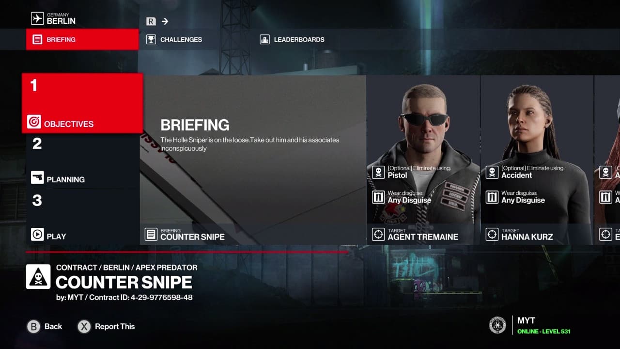 This contract is a combination of Bartoli Hunter and Disguise Hunter which greatly challenge your knowledge of Berlin map. I think it is fair contract because all required item is on the map without any special weapon or tools except you choose to bring some your self. Furthermore, the targets is quite close to the required weapons and disguises will ease the tension of treasure hunt. The targets also close to crates, dumpsters and river which help to clear up the mess since all the weapon used is non-silenced one.