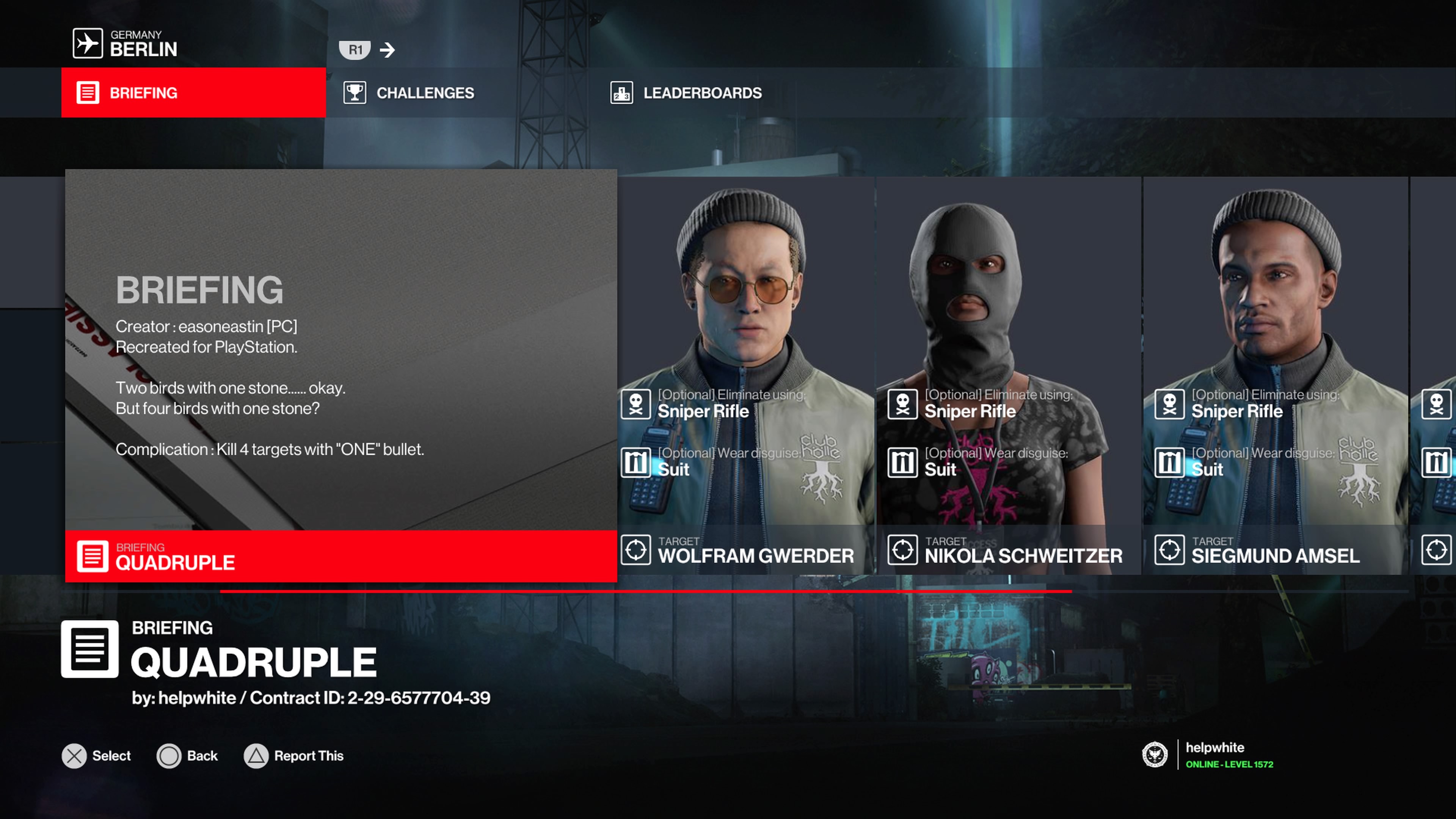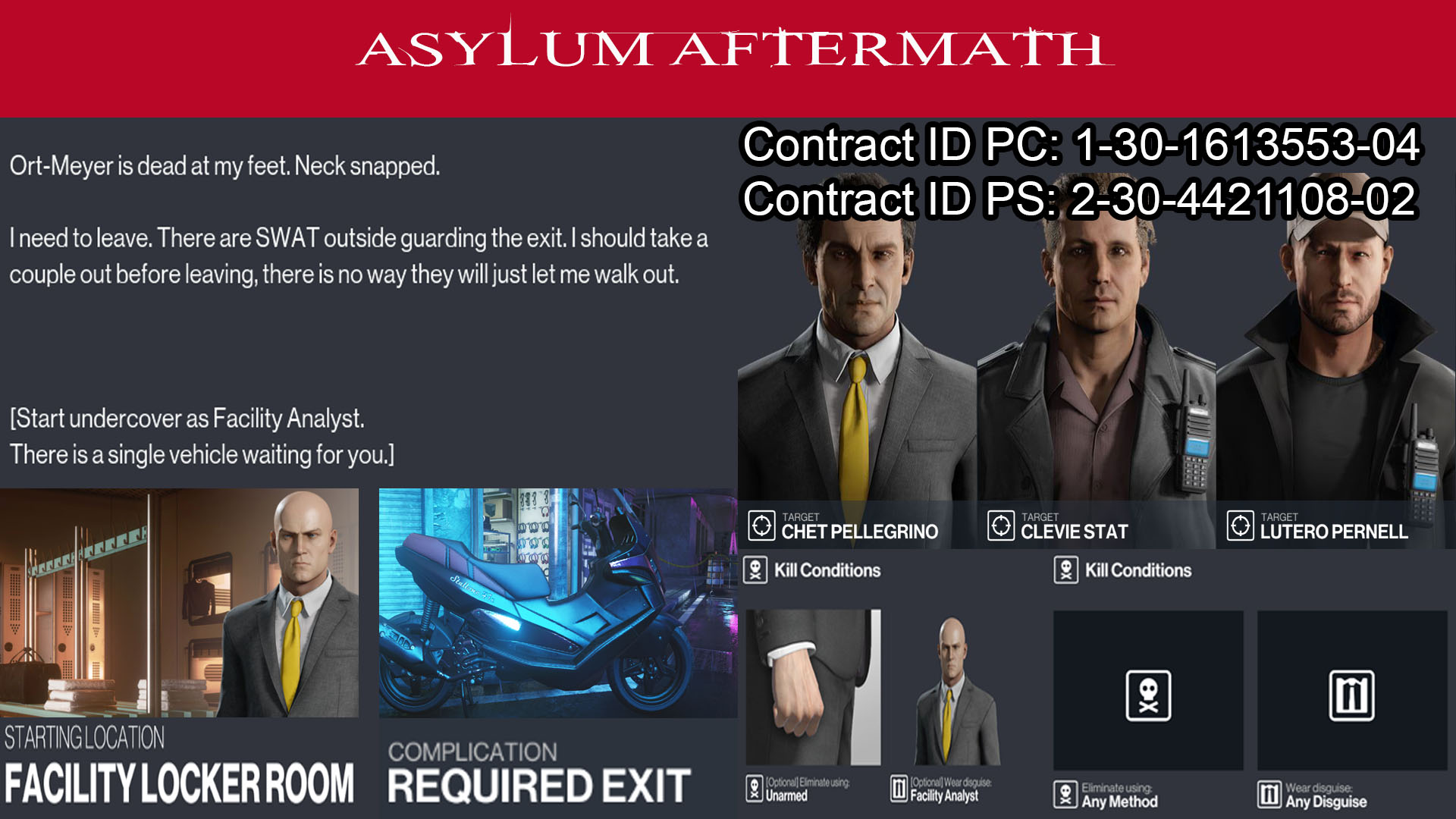 A “disguise cycle” contract here on the upper levels of Chongqing. Each target gives you the required disguise for the next one, and you can start as either a block guard or a street guard.