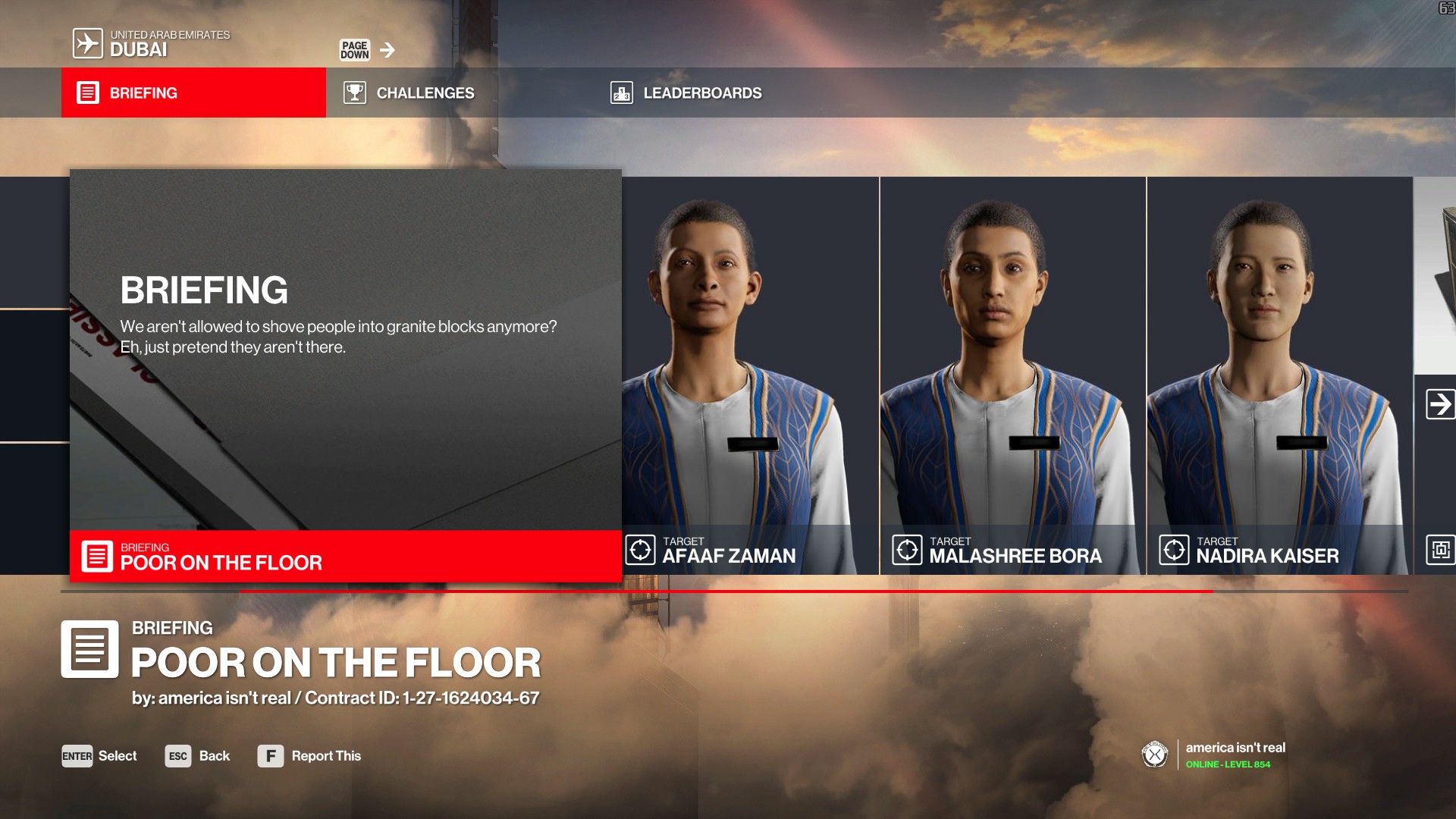 Automatically went to my favorite HITMAN NPC Heidi Santoro and wanted to make a contract around her. With all the conditions in my newer contracts (the next three absolutely not helping my case), a simple Any/Any contract is a nice palate cleanser.