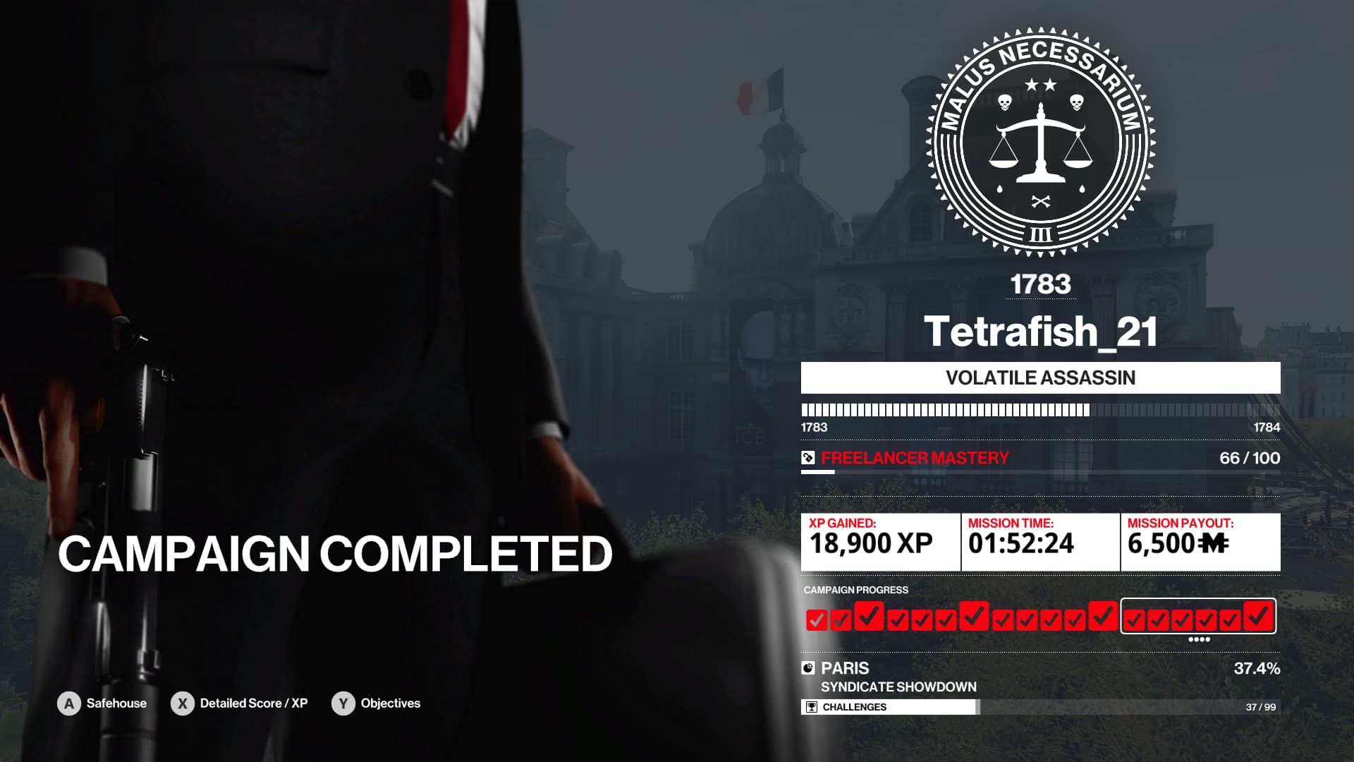 For my most recent campaign I chose to wear Agent 17’s Signature Suit, it’s pretty nice. I’ve now reached Mastery 92 and am 20% of the way to completing Top Dog. 180 hours down, 720 to go! (though I think campaigns will go a lot faster once I don’t have to worry about doing objectives)