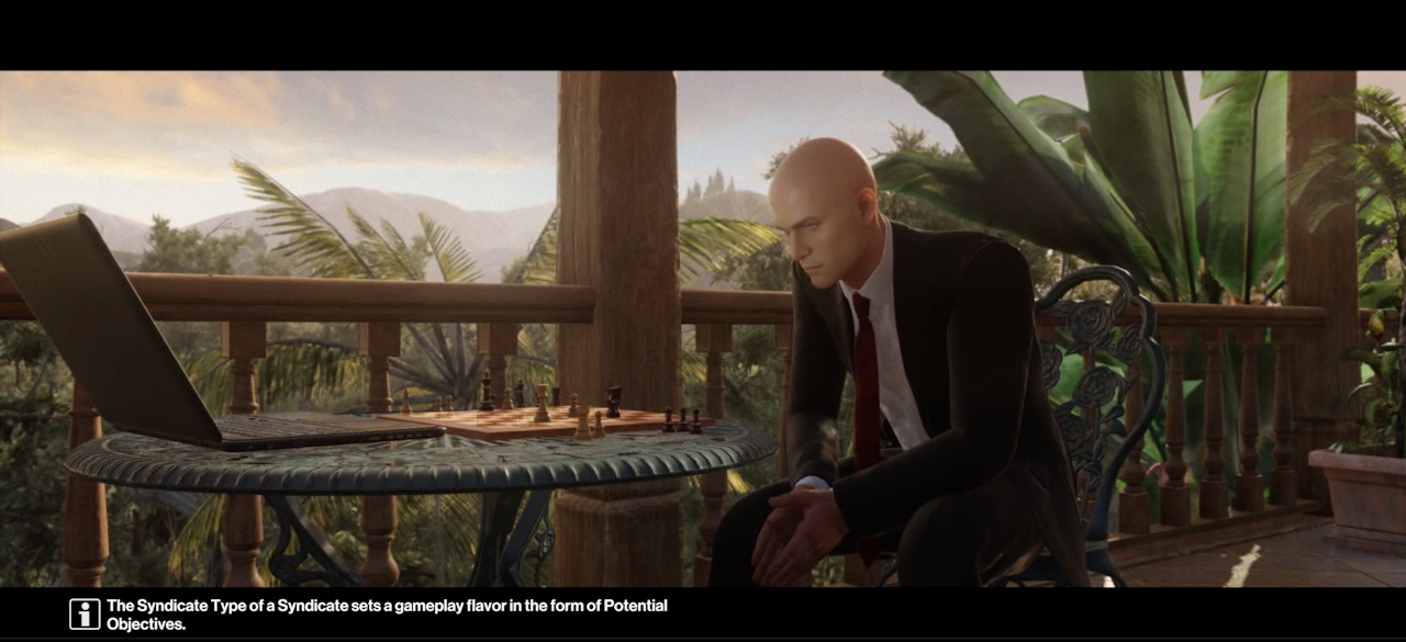 Most of the end cutscenes show 47 passing the time while heading back home. Either waiting in the airport, cleaning his pistol, sighting in his sniper rifle, and in the ones for a failed mission without dying, he seems to be just staying in a hotel room somewhere, which is where I think he is for the pistol and sniper scenes too. Taking all of that into account, I’m gonna guess he’s on the balcony of a hotel room in some tropical location, waiting for the next available flight or ferry to continue the trip home, and he’s just passing the time playing chess across from a laptop (which I would guess is either the AI, and he just likes to use actual pieces and he moves his opponent’s pieces accordingly, or Diana is on the screen as his opponent, and good luck figuring out who wins that).