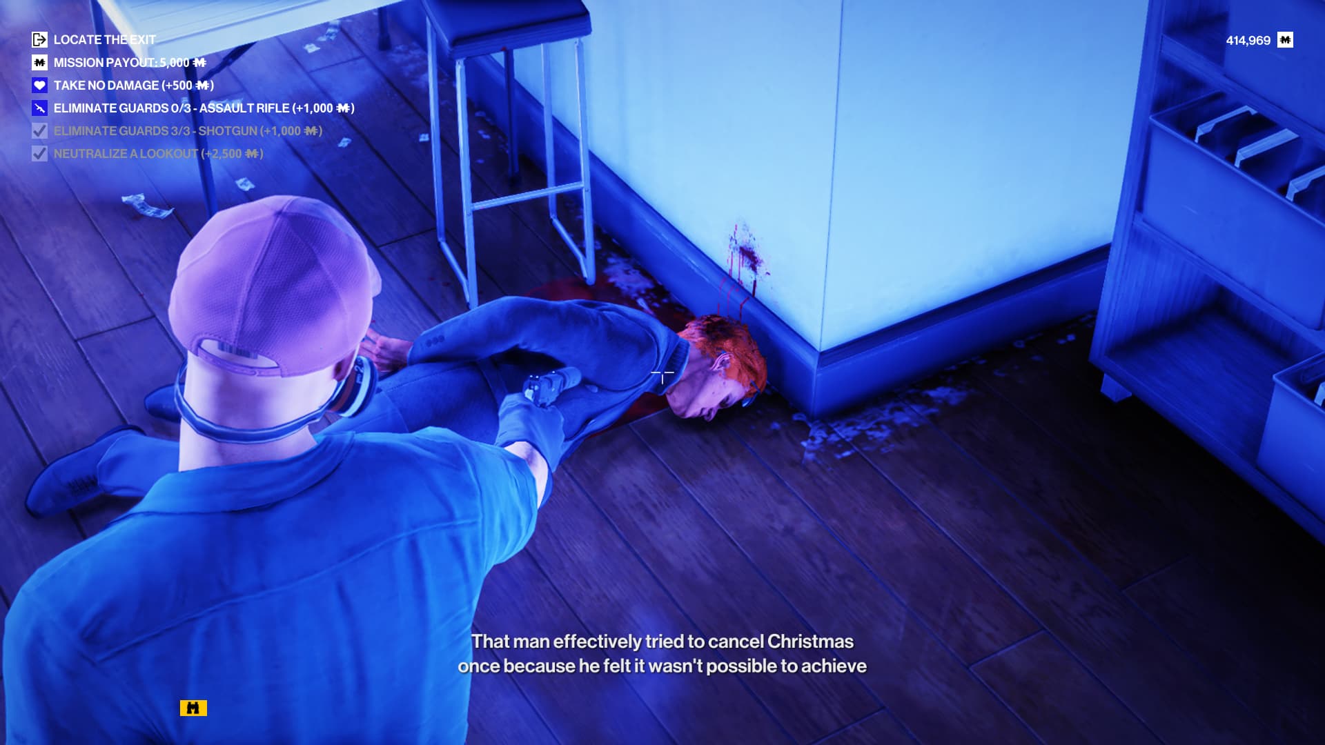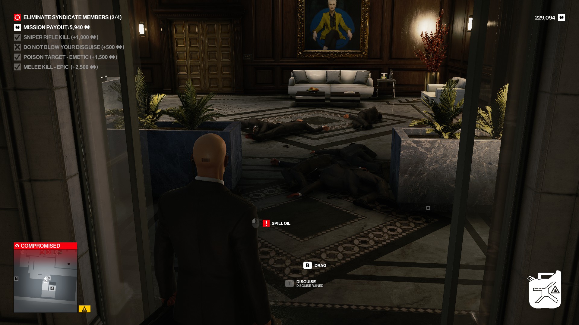 Now that I’ve gotten the hang of showdowns, my only wish, as mentioned before, is that you could hide the bodies of suspects after the real Leader has been eliminated. You’re able to hide the target’s dead body, after all, so why not be able to go back and hide those other bodies of suspects once it’s no longer and issue so that wandering NPCs, including still-active former suspects, don’t come across the bodies and potentially ruin an objective as you make your way to an exit?