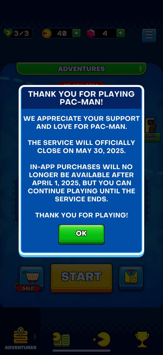 The mobile version of pac-man is shutting down on may 30th