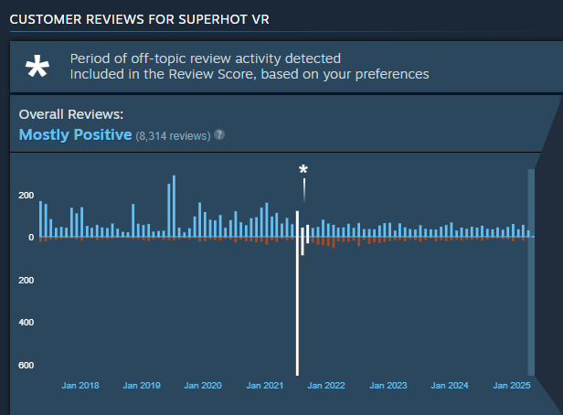 The game was bombarded with negative reviews for a short time, but as new players who bought SUPERHOT VR didn’t know it was missing anything, the reviews went back to reflecting the (still very good) gameplay shortly after.