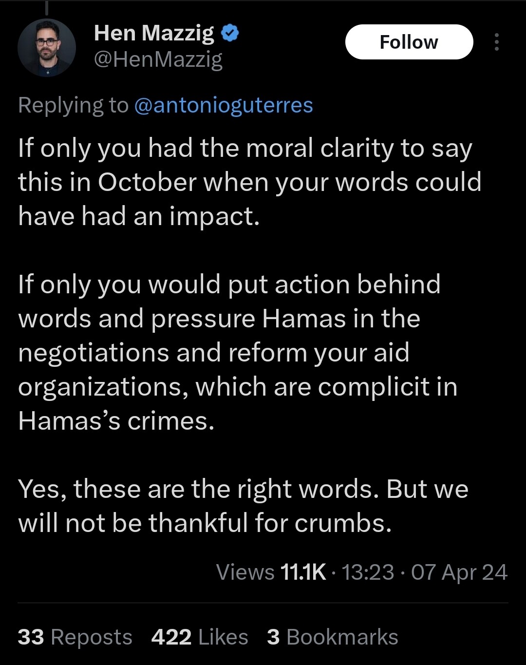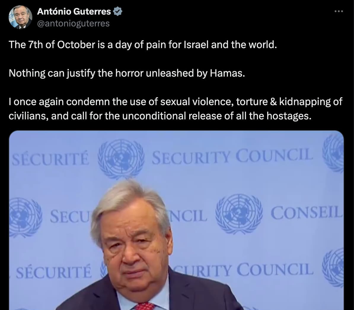 You mentioned that Gutteres did condemned the attacks conducted by Hamas on Oct. 7th but you forgot to mention when he posted said tweet. It was posted on April 7th., 6 whole months after the attack he gave a very dry message regarding the attacks.