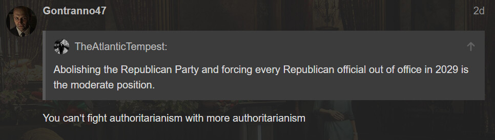 Does supporting the system of democracy mean supporting vigilantism against Trump appointees? Are you saying you support random people shooting everyone from Trump himself to JD Vance to Big Balls to every single member of ICE in the street and leaving their body to rot as warning to others? Because that seems a lot more extreme than dissolving the Republican party.