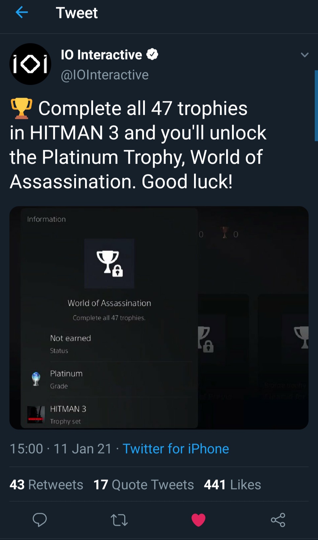 PlayStation trophy list if anyone is interested: HITMAN 3 Trophies | TrueTrophies