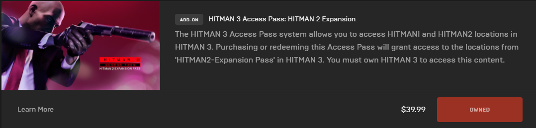 Description: Not letting me play Hitman2 expansion, DLC installed and verified from Epic game