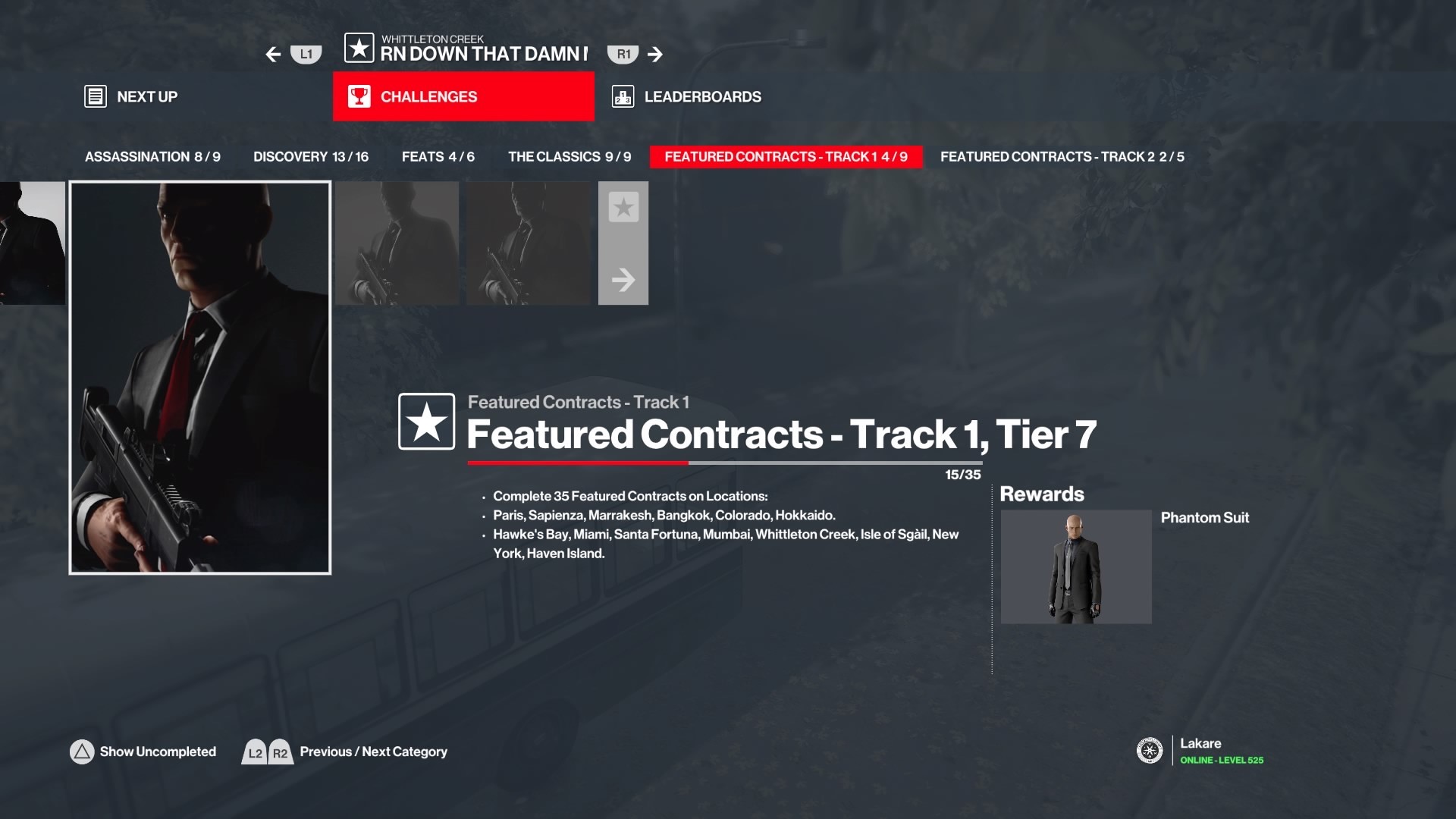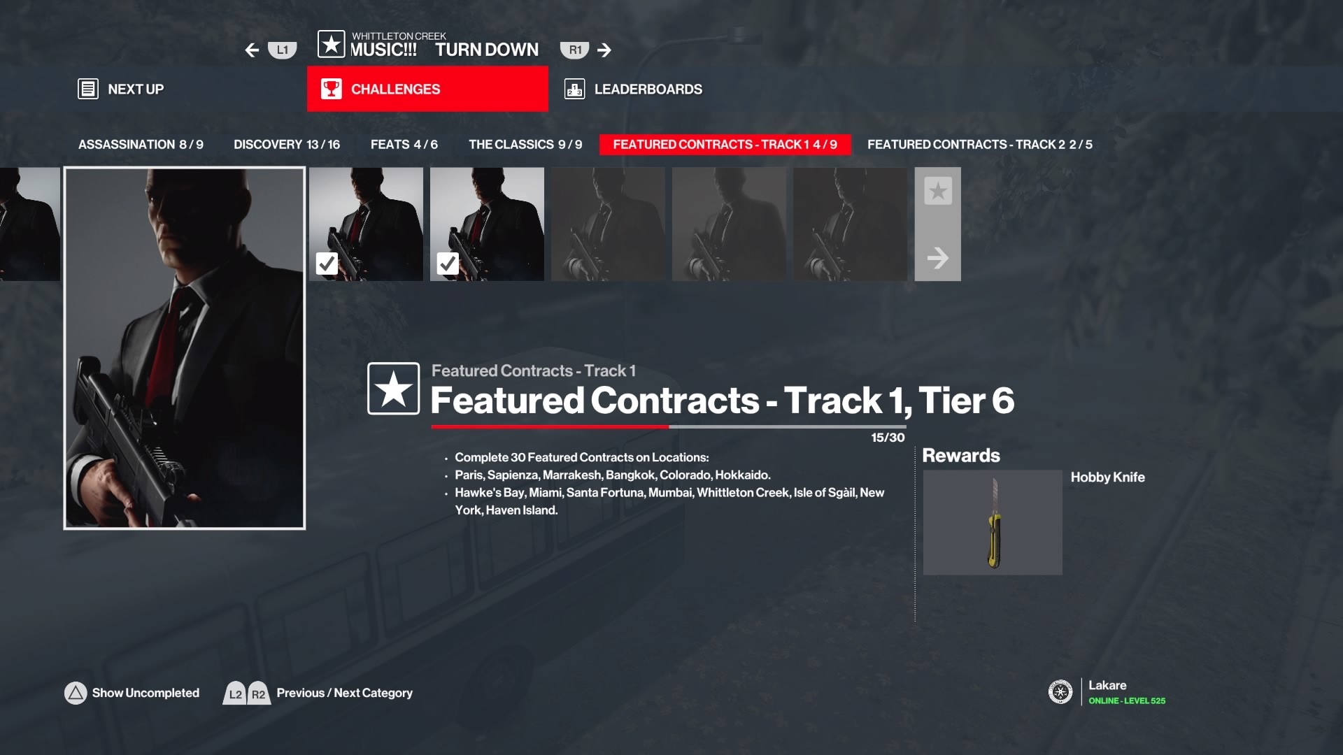 Featured Contracts - Track 1 Tier 3: This challenge was already marked completed after the progression carryover. However, I don’t have the reward (Red-Tie Kiwi) in my inventory and therefore no way to unlock the item. The same goes for Track 1 Tier 4, however in this case I already had the item unlocked in Hitman 2, so no problem.