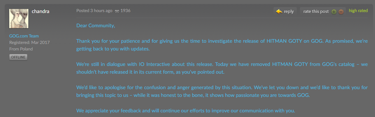 We’re still in dialogue with IO Interactive about this release. Today we have removed HITMAN GOTY from GOG’s catalog – we shouldn’t have released it in its current form, as you’ve pointed out.