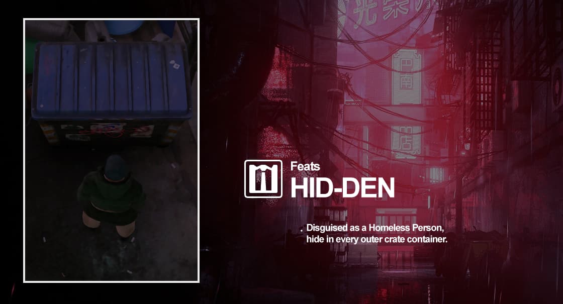 - Disguised as a Homeless Person, hide in every outer crate container.
