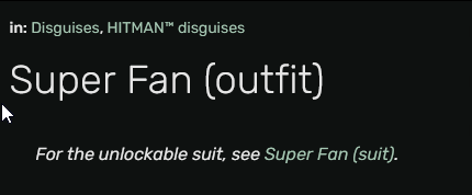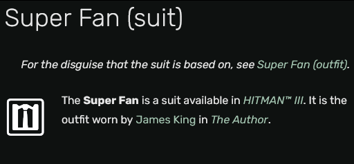 In fact, the Hitman Wiki has to have specific disambiguation redirects because the reader could be looking for either the suit or the disguise. It’s not a good look to have that sort of ambiguity in the game when learning or when researching it. It’s actually quite annoying.