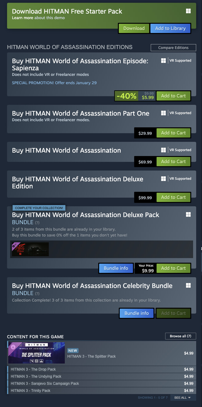 Some game bundles retroactively list themselves as “Owned or Purchased” if you own the main game and all DLC, but others… don’t, like Hitman for some reason.