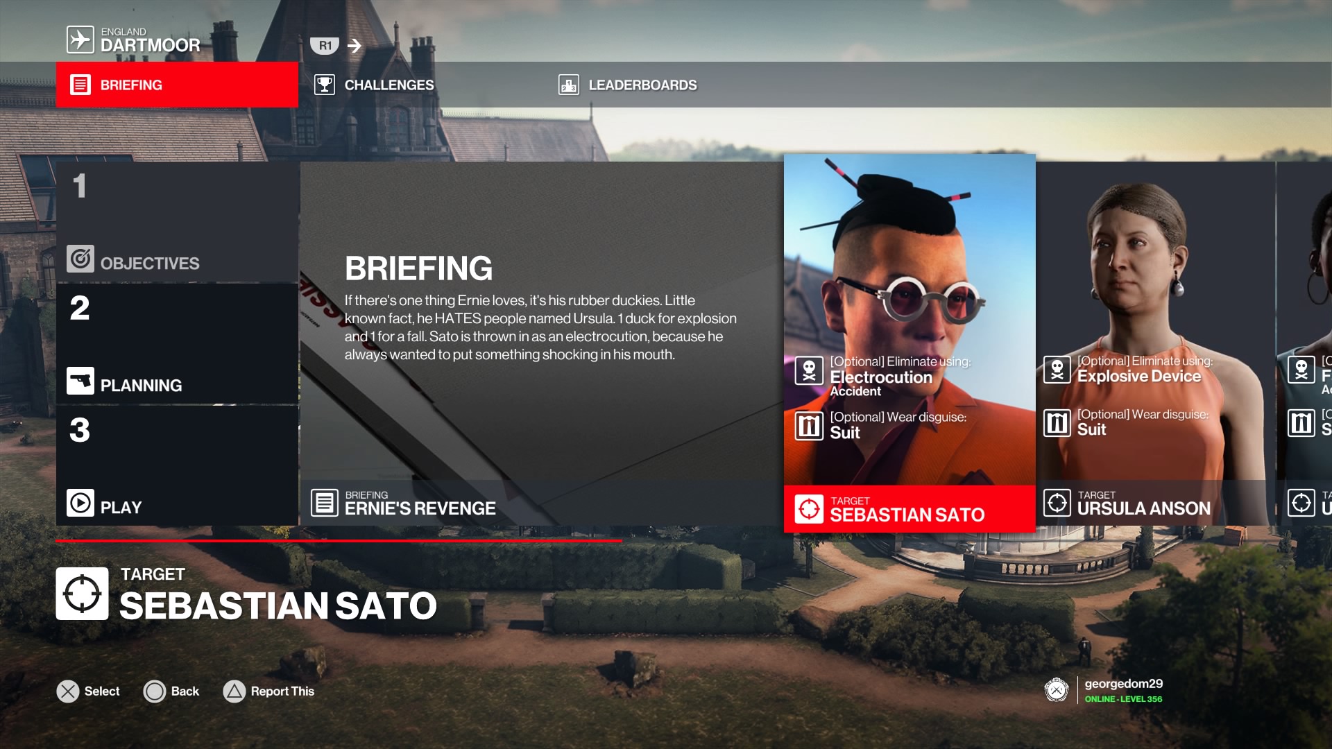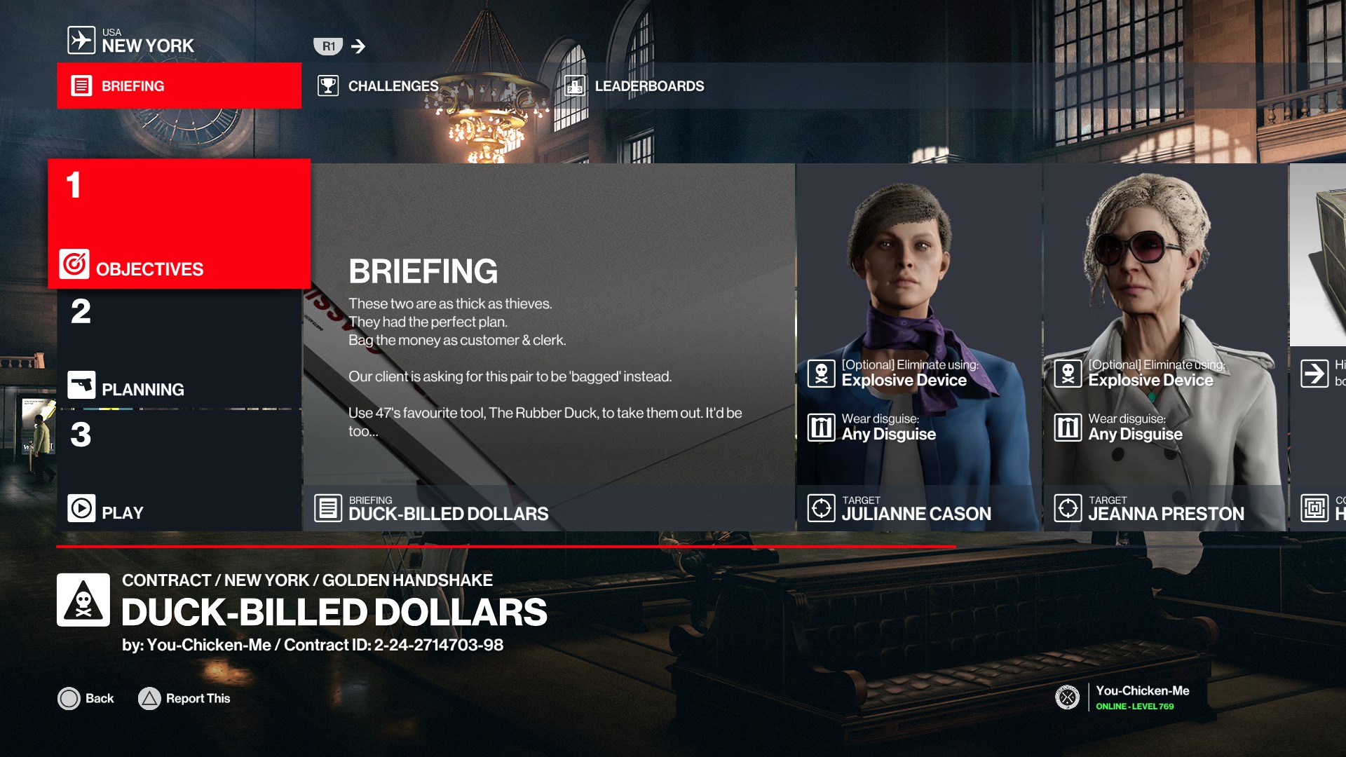 You eliminate your targets with 2 rubber ducks, 1 for the gardeners and 1 for the plumbers. The ducks are preferably remotely detonated ducks. You canât change your starting suit, you canât get spotted by cameras, only targets are to be killed and no bodies found.