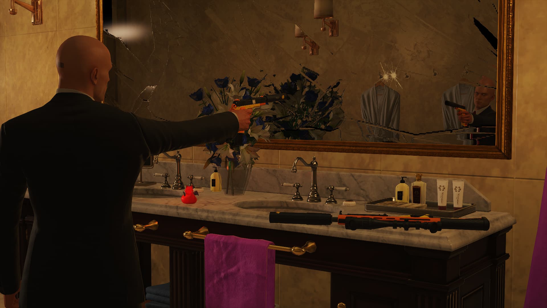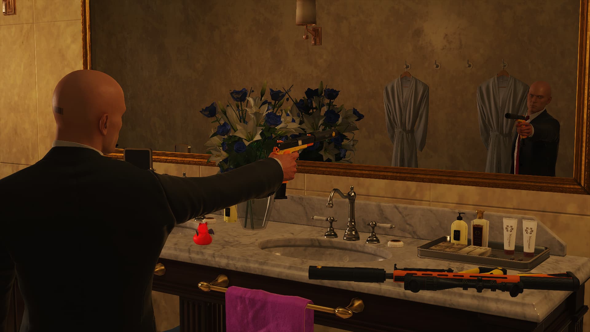 47 holding the ducky pistol up against a mirror with the ducky sniper and a ducky laying around: