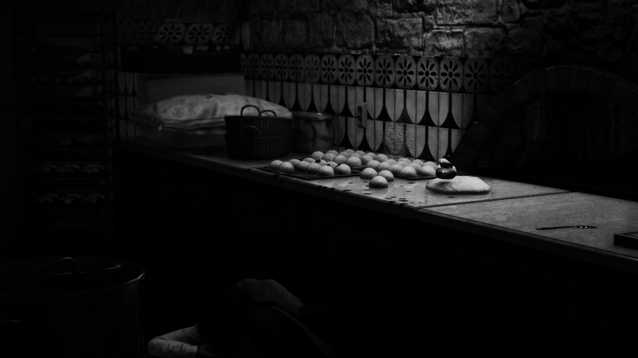 Photo: a man enjoying his midnight shift behind the oven in the café, and his night guardian protecting him.