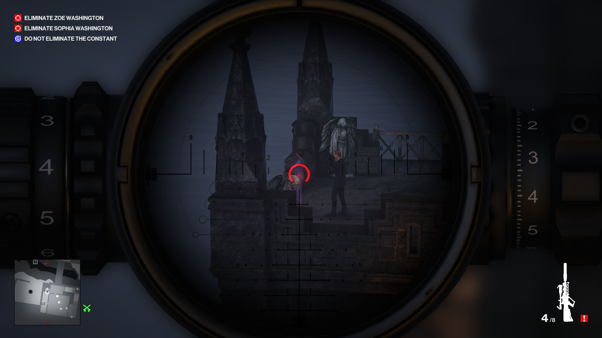 Setting up the meeting between the Constant and Sophia Washington could’ve been a good idea for a sniper kill, but unless you’re close enough they never start talking. After a long while the script just terminates and they head down together. You can cheese it with a distraction shot or two, but the scenario where Sophia is left alone on the balcony never happens.