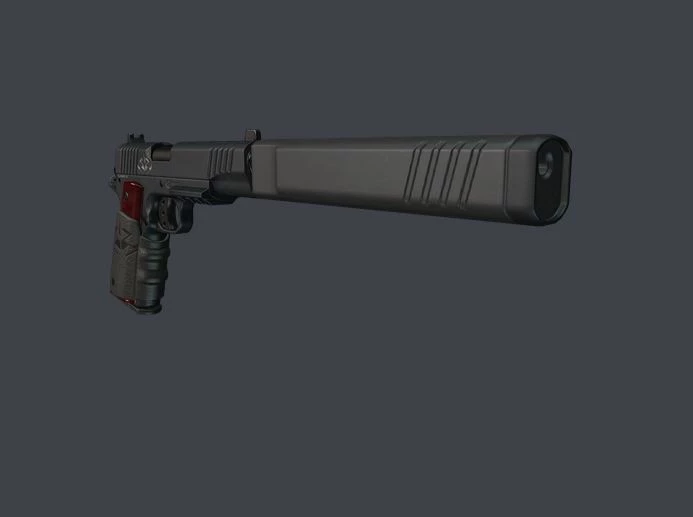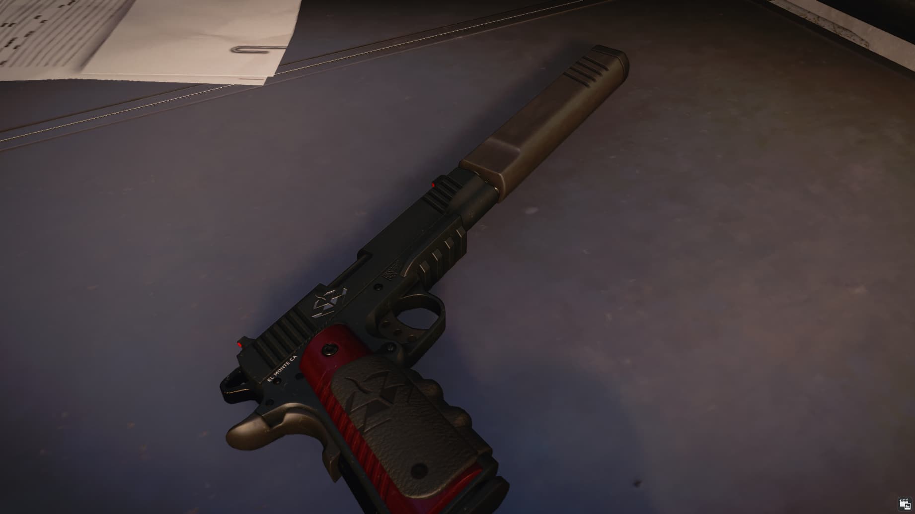 A blood-red Baller pistol with an unique silencer and an engraving of the modernized variant of the Fleur de Lys. Already mentioned by @LandirtHome above, it has been sitting in the game files for years.