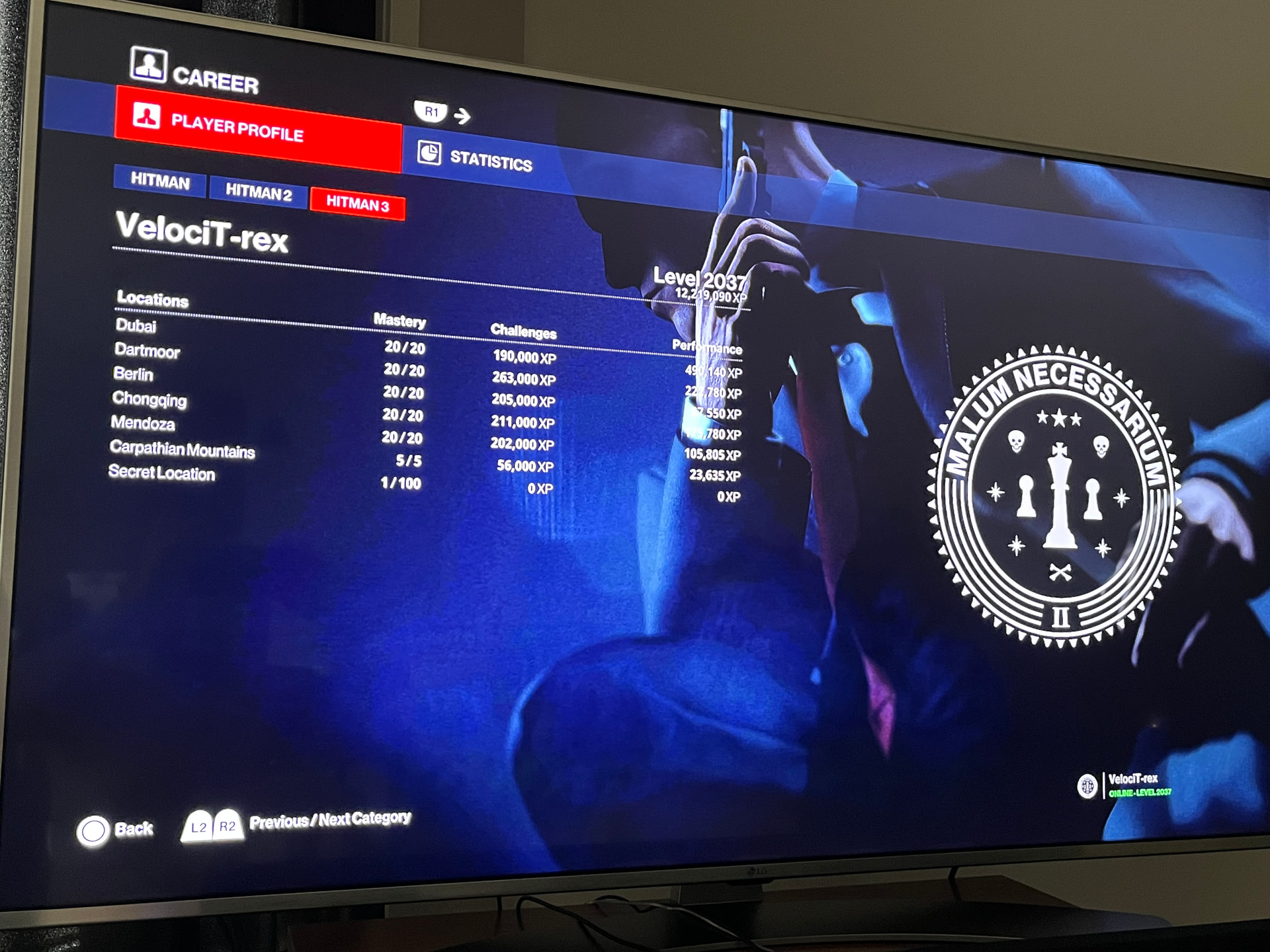 The issue in question is on the Player Profile page under the Career tab in Hitman WOA. All of these pages have an image of 47 posing, and the PP page is no different. However, the image used makes the content on the page difficult to read (especially for someone such as me, whose eyes aren’t great).