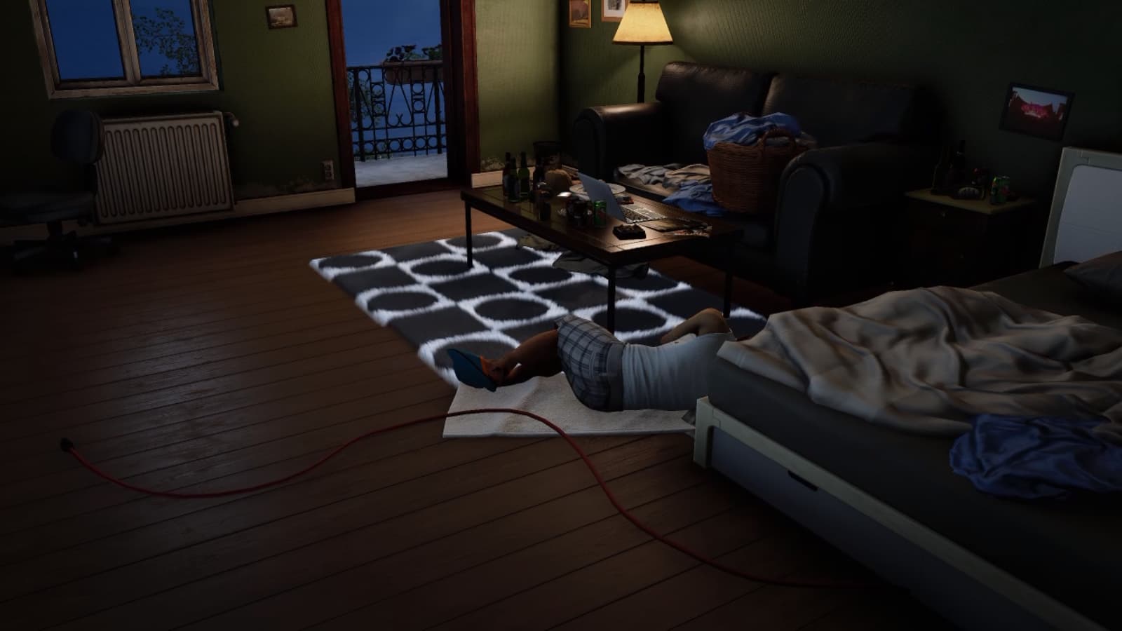 Then, you have to be quick about this: Trigger the flash phone to blind those 3, run past them, create a bullet distraction to distract the guard outside your normal room from the main Hokkaido mission so he looks away from the door, hack the door so you can get inside, and hide in the closet because the flash phone should now be panicking those guards. Once that’s settled down, you can use the railing from the patio to shimmy your way over to Dexter’s room.