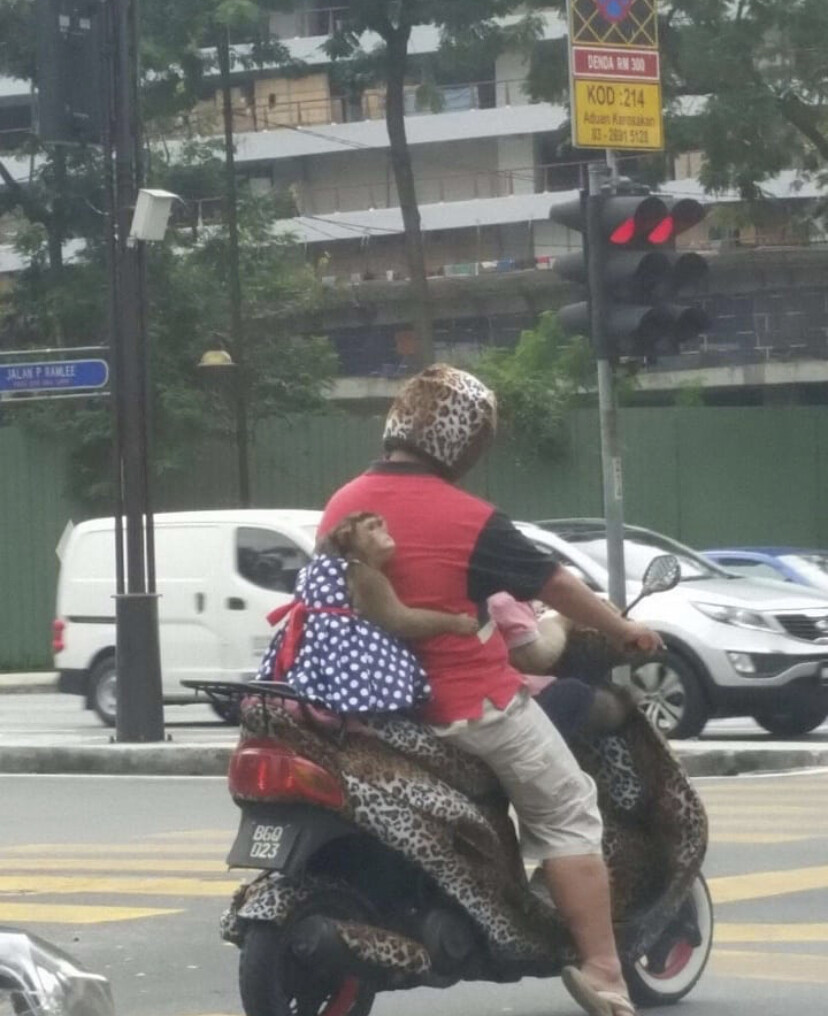 This is a cute picture and all, but I’m worried about the monkey riding the motorcycle with the guy since they’re not supposed to be pets. Any news on its condition?