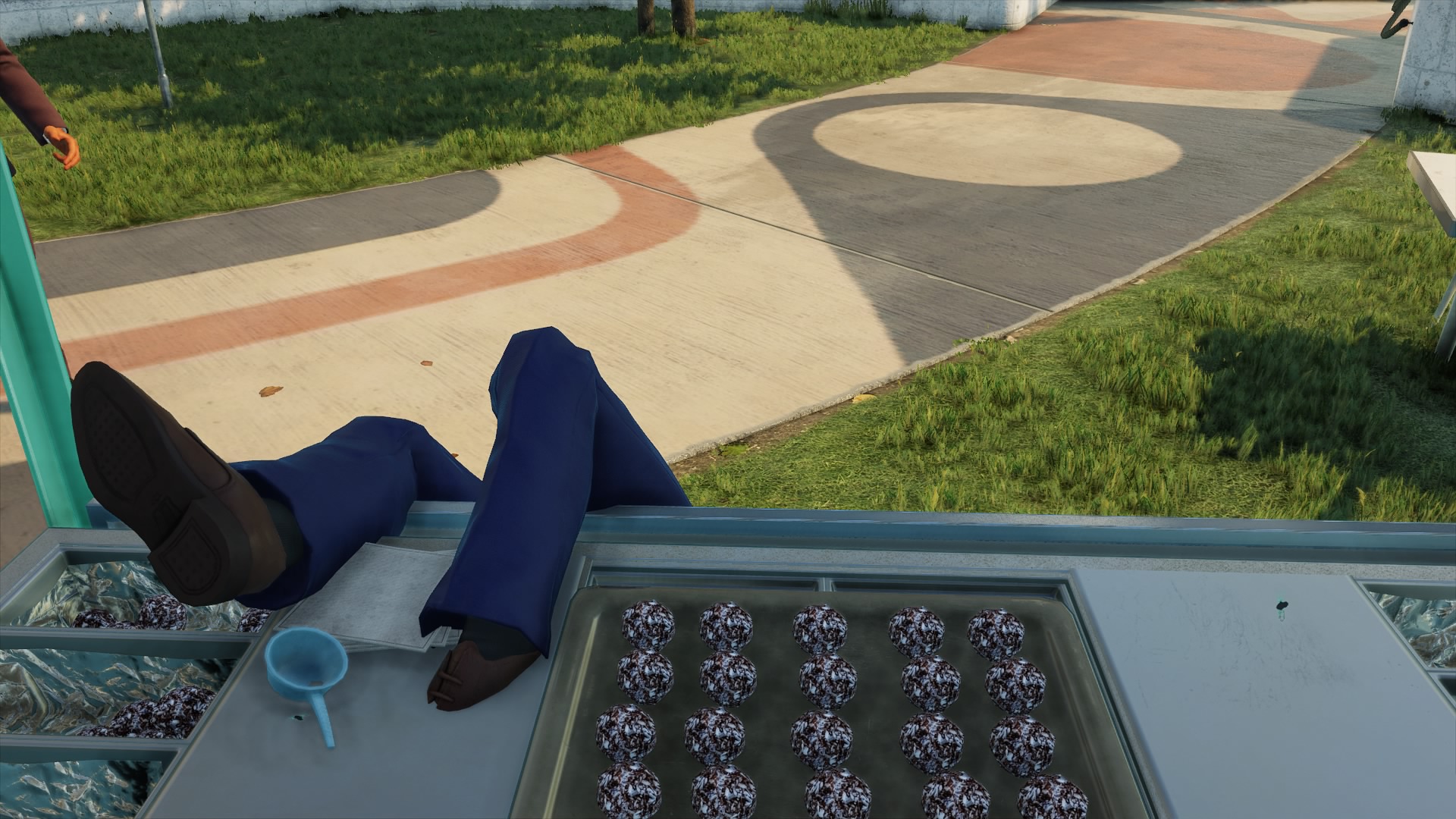 I was playing around in Miami and went to poison Robert Knox and this happened lol after eating the coconut balls, his body just sort of… “glitched-out” and somehow his foot got stuck on the food stand😂