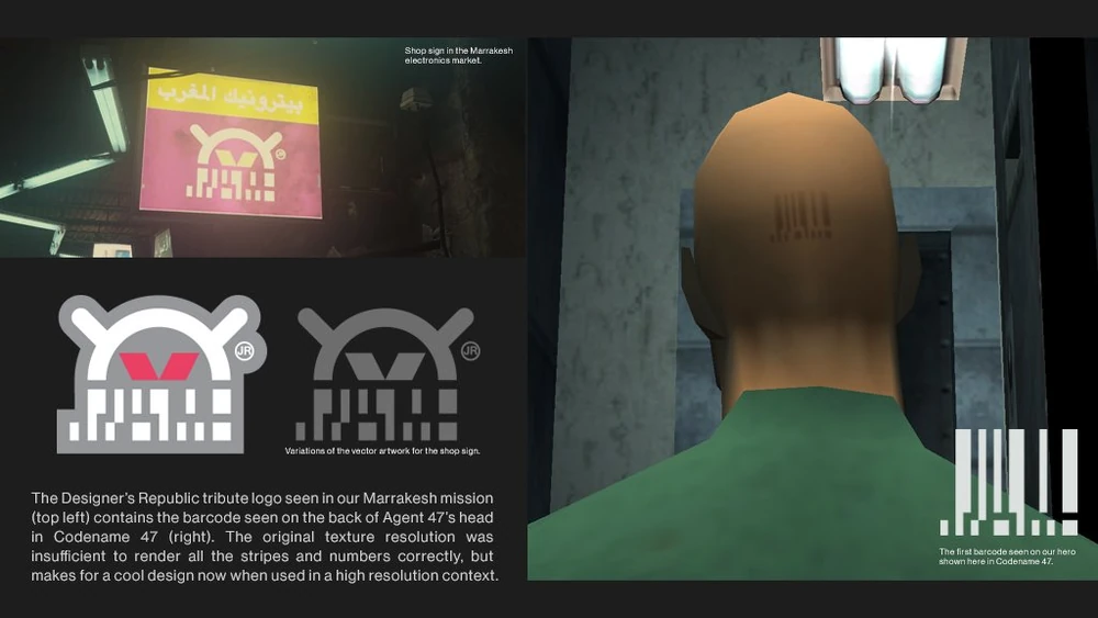 There’s also this Marrakesh easter egg which is sorta related. An in-game brand logo was made using Codename 47’s OG rendition of the barcode, which did notably include the numbers below the barcode, just as mere blurry pixels…