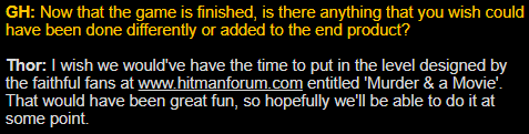 In my recent reading spree of old archived interviews, I found this in one for Hitman: Contracts.