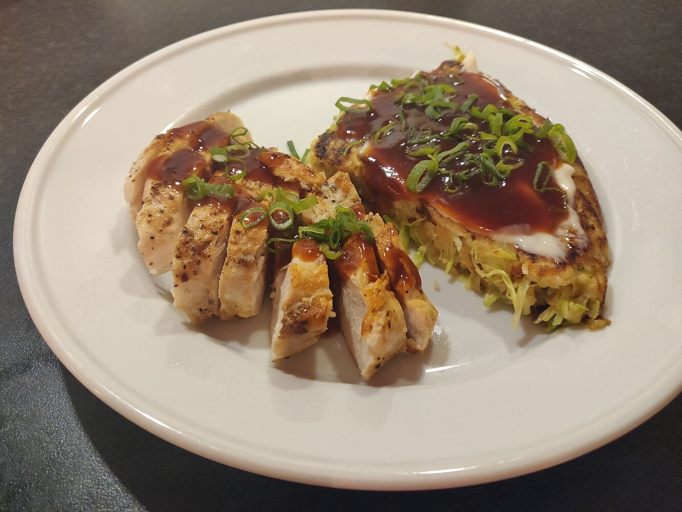 A Japanse cabbage pancake called Okonomiyaki served with mayonnaise and Okonomiyaki sauce. Chicken breast on the side.