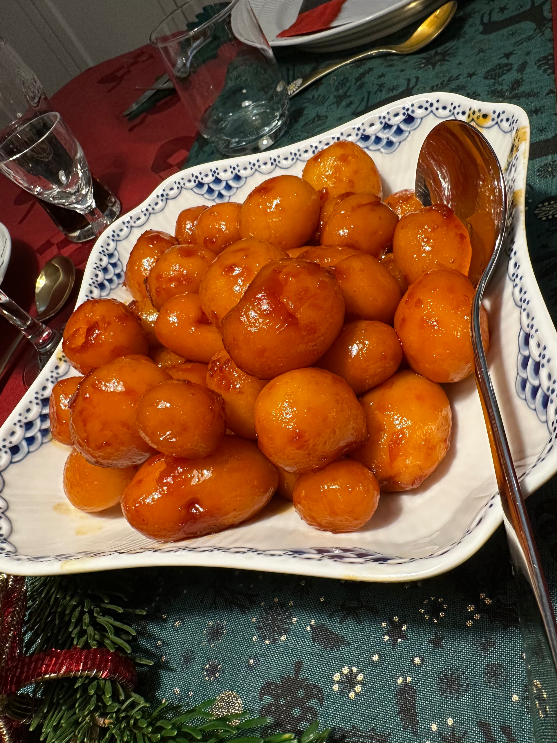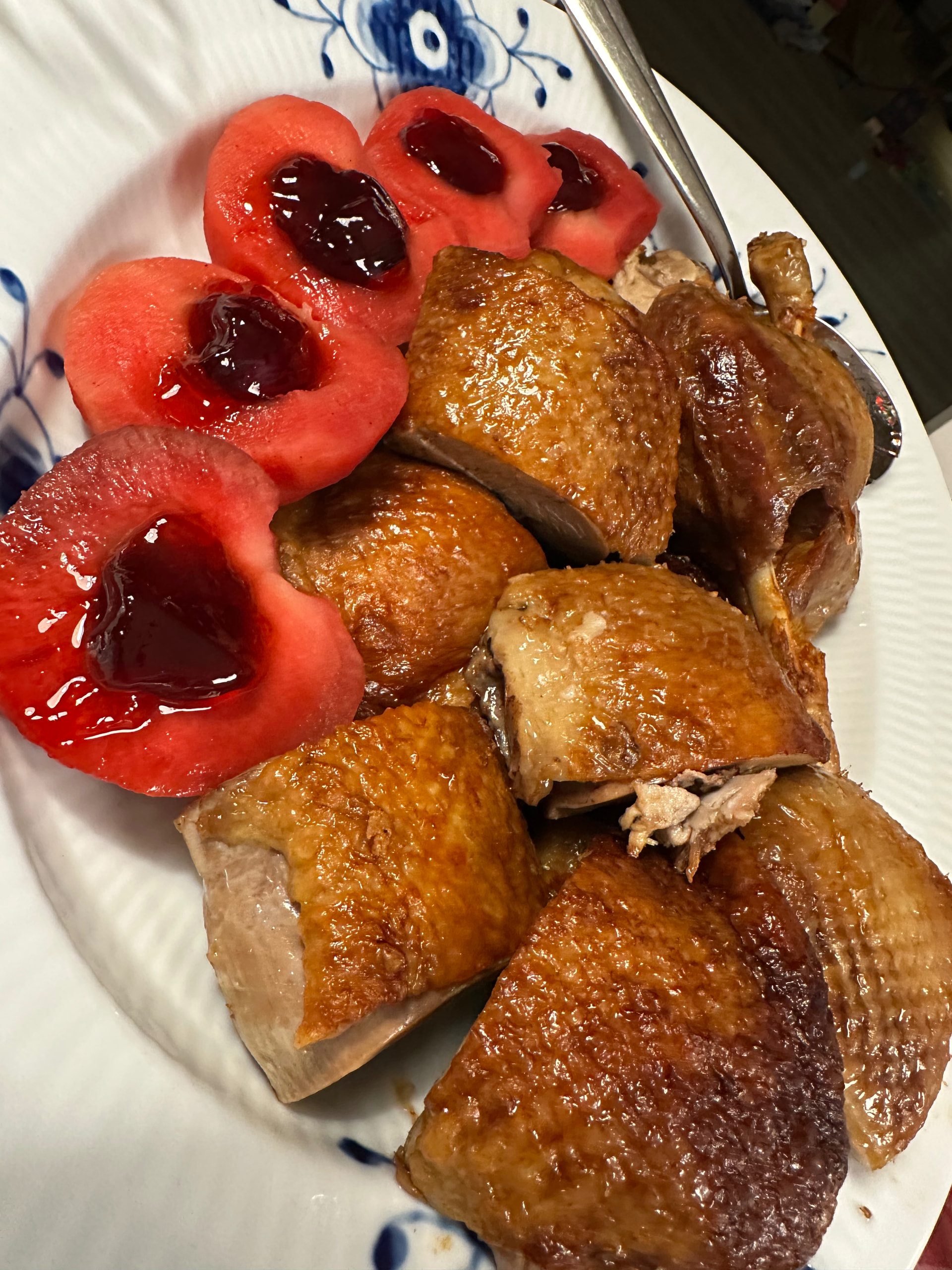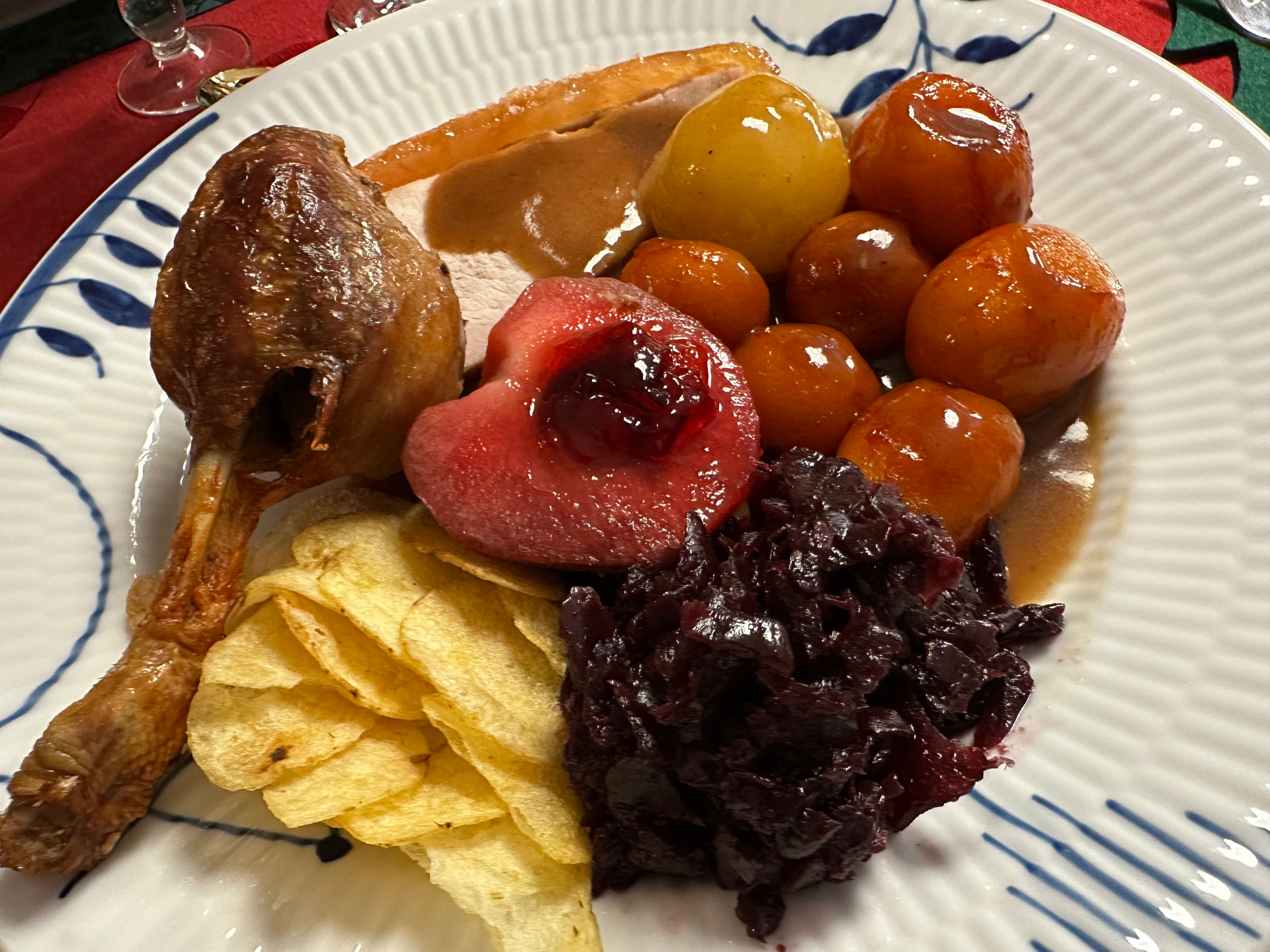 Pork roast, Duck, caramelised potatoes, gravy, pickled red cabbage and chips/crisps. The apple was a new edition, but also a classic side dish.
