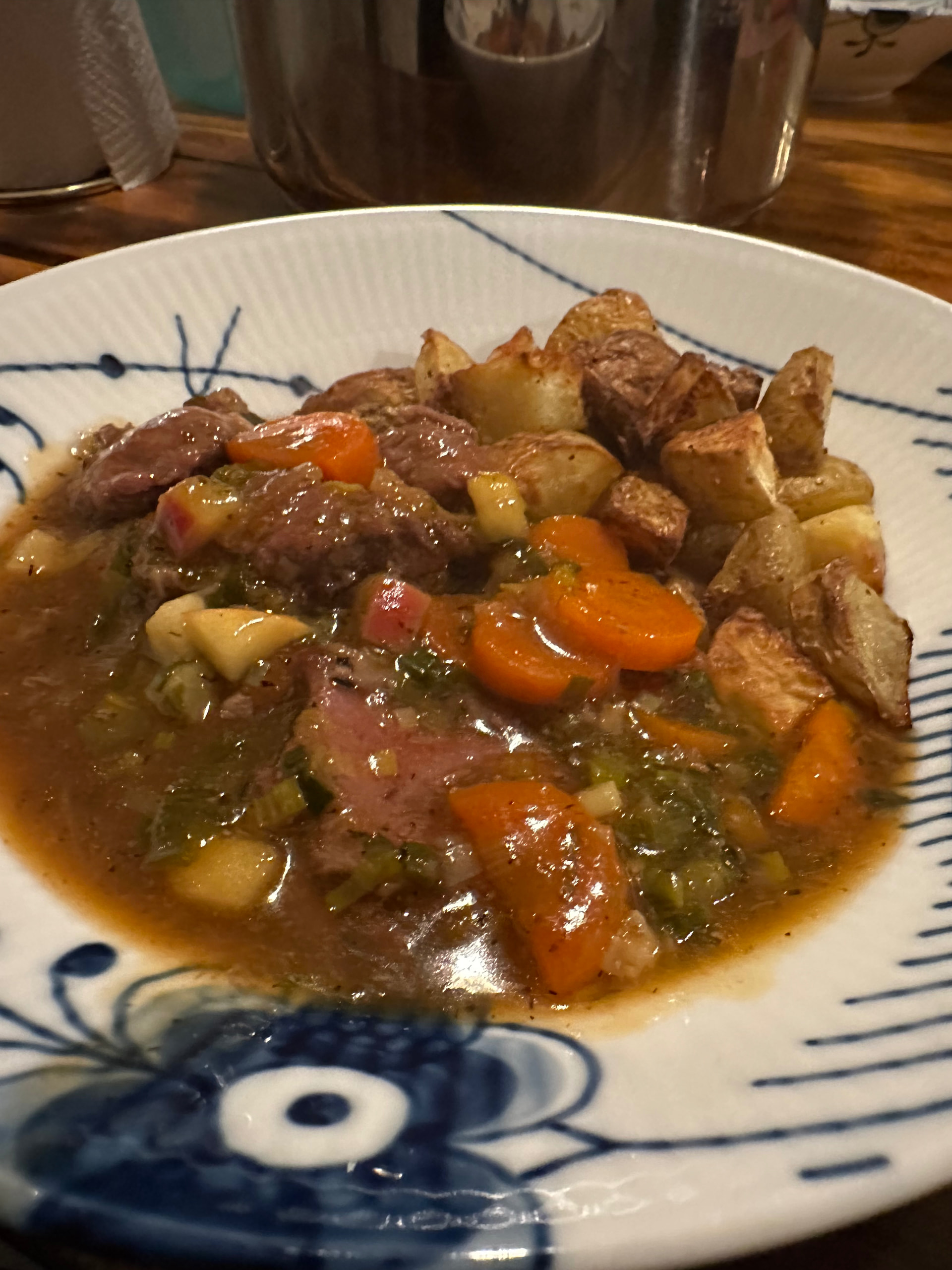 Pork jowls braised in a brown ale, with vegetables and apples. Served with oven roasted potatoes.