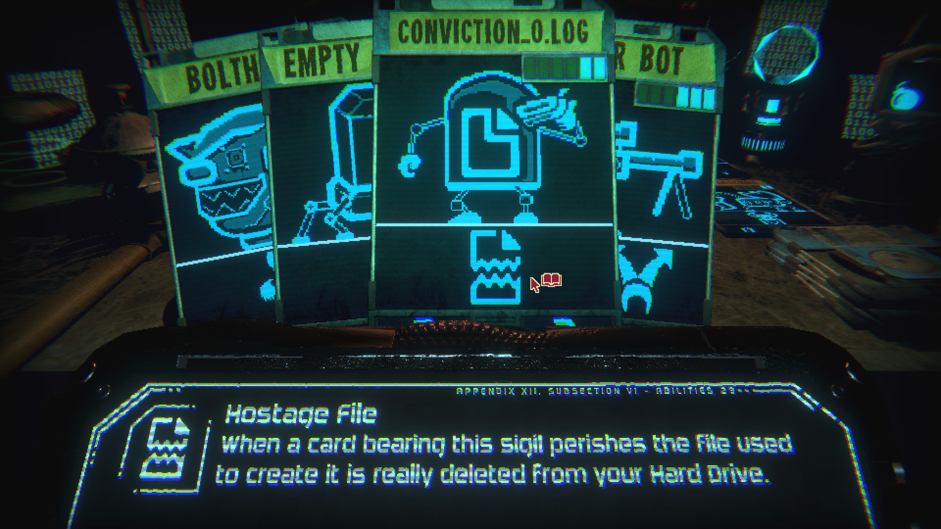 The 4th wall breaks involving Your PC System was cool. Having to find a folder of great size to tip the game scales was neat. Then the kicker of finding an old file, and it being held hostage under threat of deletion if you lose it was tense AF (I found out it wouldn’t delete it, but adds a text file next to it, asking you to do it yourself to respect the rules) Plus I’m sure it limits what files can be displayed, so you don’t offer up anything too crucial in your system – I looked into my Ubisoft Games, and only found one tiny file. (from Splinter Cell: Conviction)