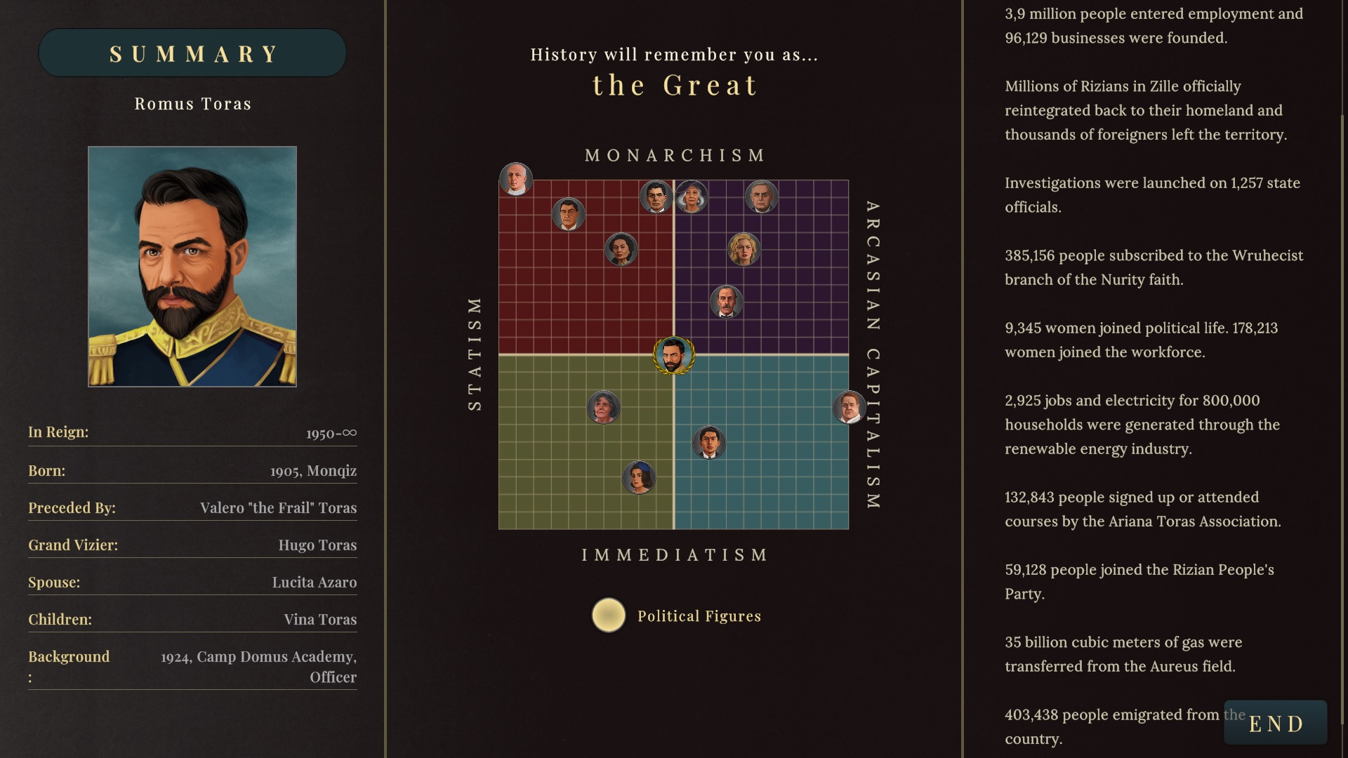 Game ends in 1958 - just managed to pull through without a coup/revolution/abdication/death. (Infinity would be nice though… *happy monarch noises)