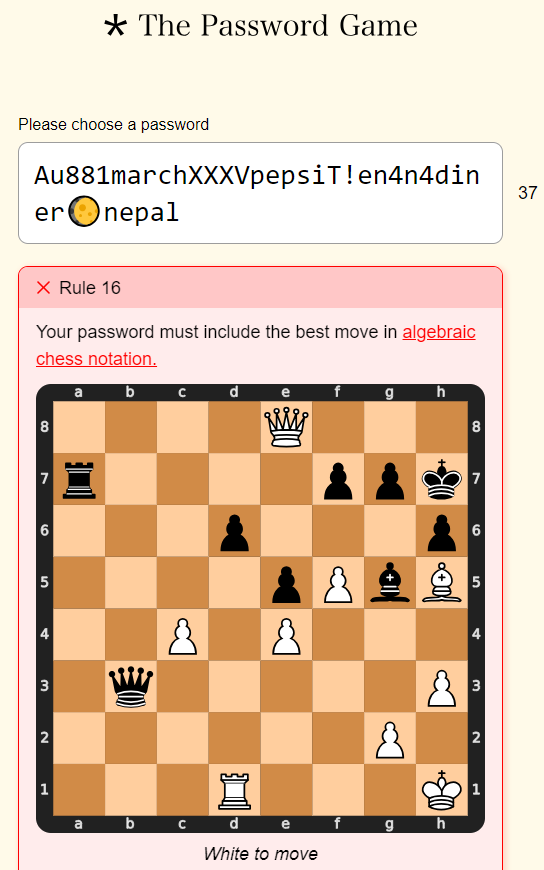 I am no Chess genius but I think the answer is Qb1+ (White’s Queen to B1) since I am pretty sure that puts the king in check. But I am no chess whiz so I could and most likely am wrong. also any site that makes me play chess to generate a password just isn’t worth it.