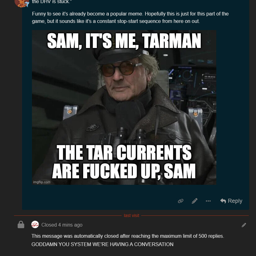 Sam, it’s Tarman. The forums fucked up the Tar Currents, Sam. We can’t continue this DM with Silvereyes until you make a new Tar Thread.