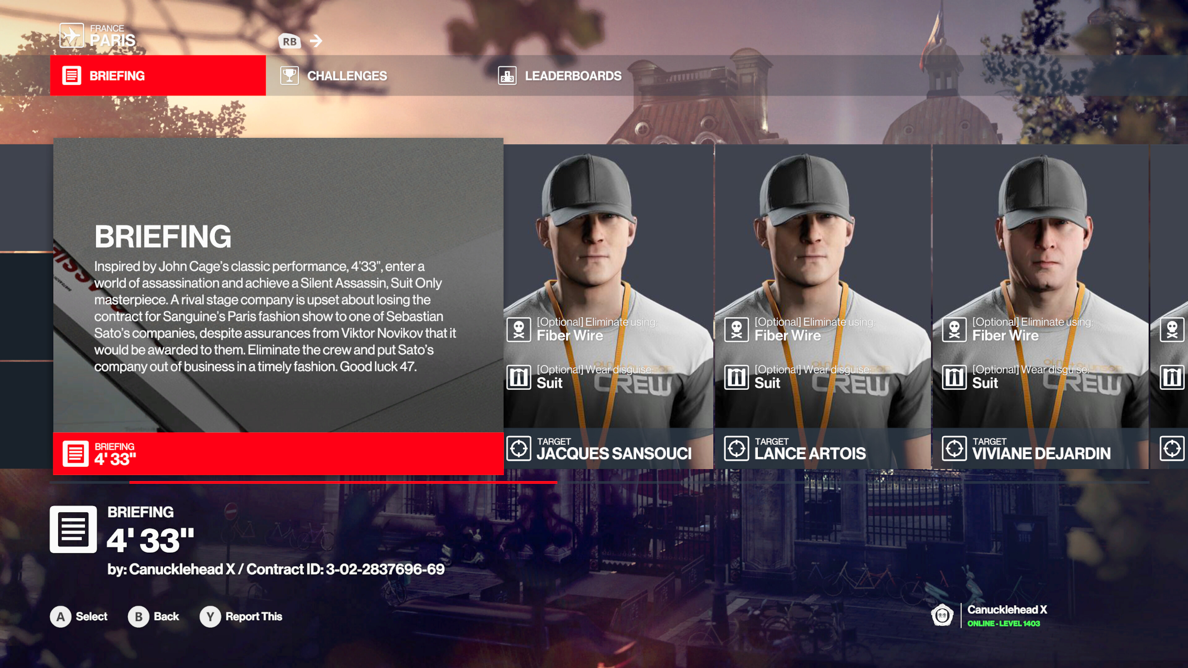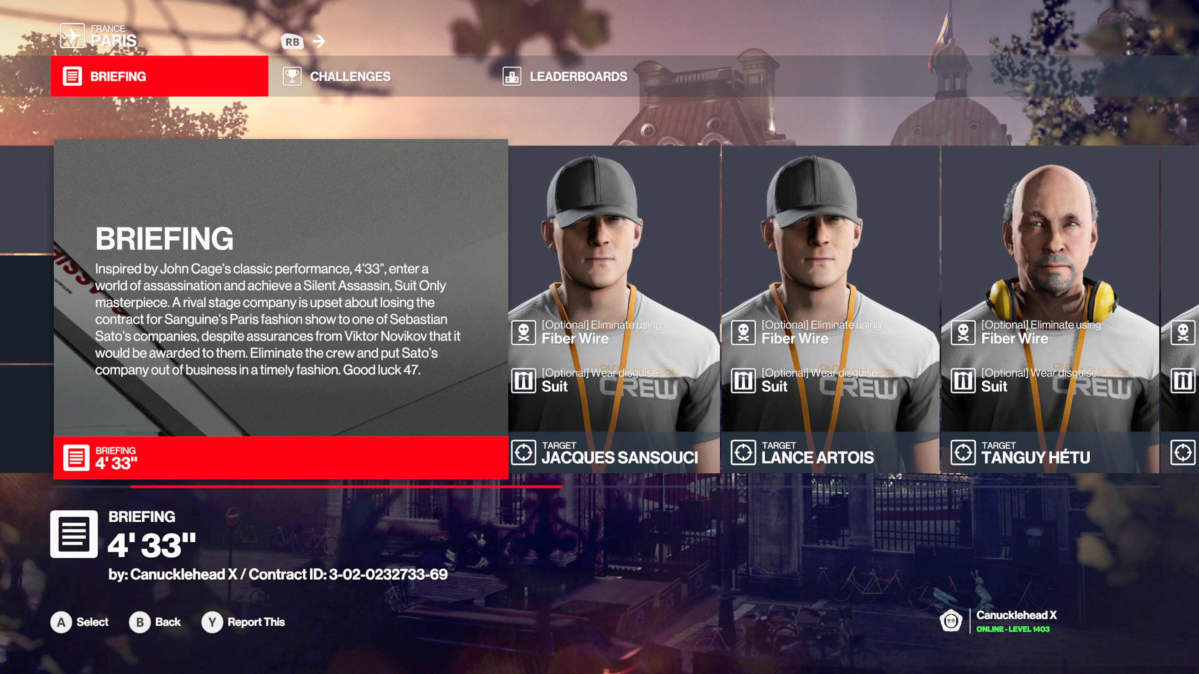 Inspired by John Cage’s classic performance, 4’33”, enter a world of assassination and achieve a Silent Assassin, Suit Only masterpiece. A rival stage company is upset about losing the contract for Sanguine’s Paris fashion show to one of Sebastian Sato’s companies, despite assurances from Viktor Novikov that it would be awarded to them. Eliminate the crew and put Sato’s company out of business in a timely fashion. Good luck 47.