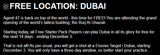 I’m saying that because it’s Dubai that is currently in free access from yesterday nov 22th to dec 5th. Until now the legacy ETs were always carefully released to have a two days of free access for Hitman III only players.